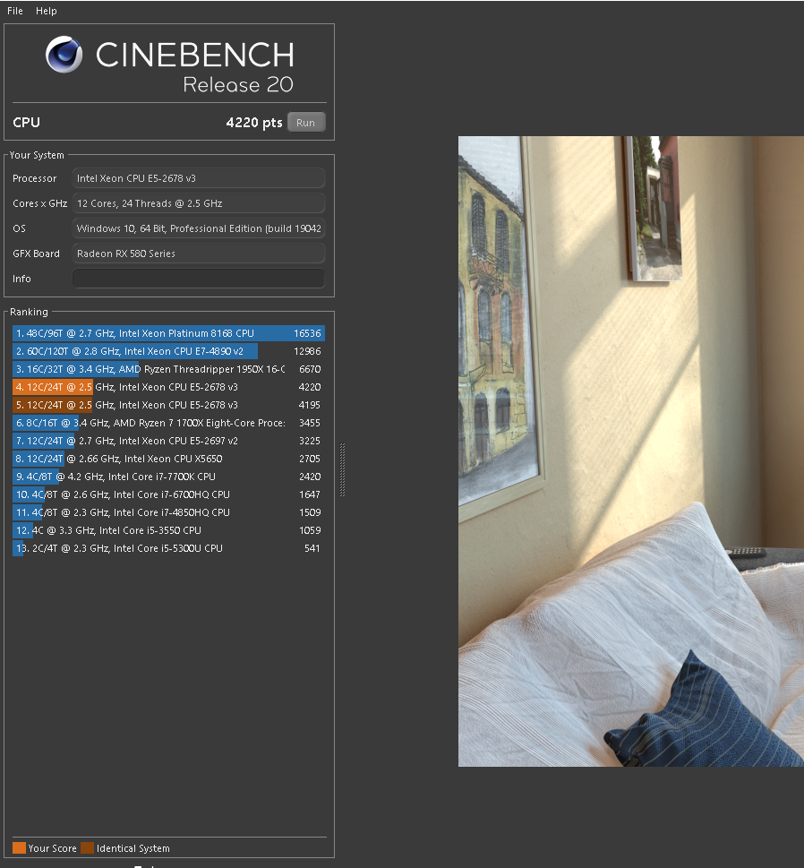 Получаем в многопотоке 12602 pts, в однопотоке 848 pts. А что там хвалёные топовые процессоры v3? Самый топ 2696v3 - 15039 pts Пред топ 2699v3 - 14854 pts. Эти два процессора опережают мой 2680v4 на 19,3 и 17,9 % соответственно. Для меня не слишком впечатляющий результат.