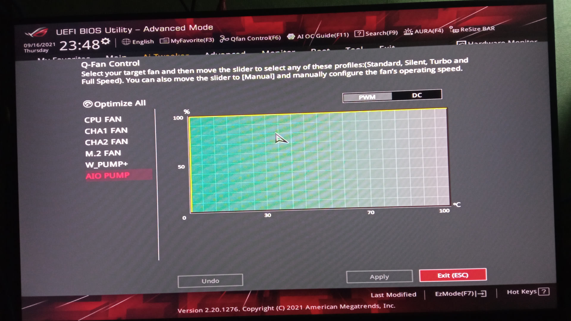 Там где регулируется везде есть Тихо, стандарт, турбо, и мануал. А в AIO Pump прямая на 100% В фан эксперте можно регулировать-но ненадёжно , заметил пока ковырял почему-то такое ощущение Авто перестает работать . Такое ощущение что Авто блокирует Виджет рабочего стола где тоже есть выбор ветерка: Тихо, стандарт, турбо и фулспид. Нажал Тихо и Авто не работает- ну или показалось что так. - удалил от греха а то заметил в игрулях на ЦП температура выше стала. Всегда удалял я этот АИ Суит и Фан эксперт вносит они свою лепту в настройки Биоса - не надёжно.