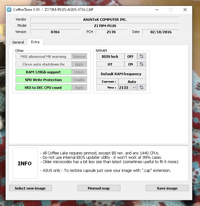 CoffeeTime 0.92 [ Я.Диск ][ Mega ] Автор: svarmod Эта версия не содержит автомодификации, все изменения в биосе проводятся "вручную"; предоставляется без каких-либо подсказок, с GUI, новыми фишками и прочими удобствами. Больше информации о новой версии на [ Страница 407 ]