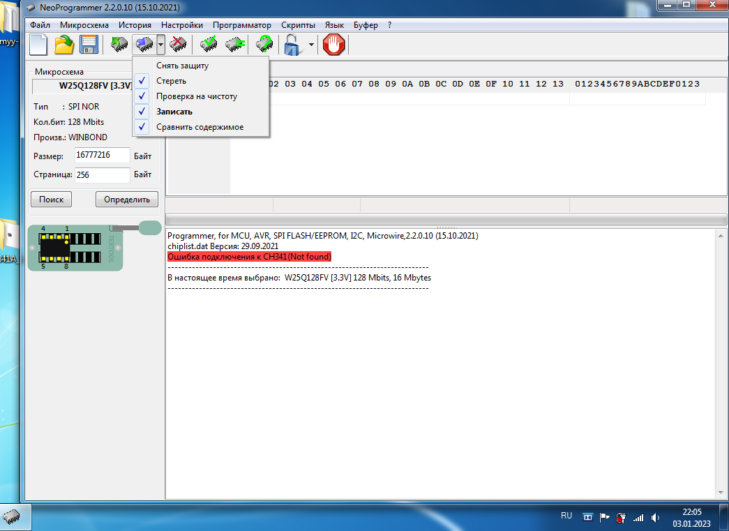 Для CH341A рекомендуется использовать программы: - CH341A Programmer v1.18 [Скачать] - AsProgrammer [Скачать] - Colibri [Скачать]