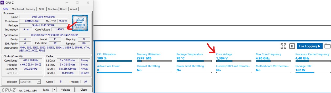 У меня точно так же. В биосе если выставляю множитель 48х все до винды не доходит. Тоже так же грешу на не удачность экземпляра. Но не давно ради интереса скачал XTU intel, и попробовал там выставить множитель и на удивление даже 5.10 ghz держит. Самое важное что заметил, что в программах OCCT, CPU-Z напряжение 1.504 при выставлении множителя 51, в XTU куда меньше на -+100 напряжение. Сейчас специально скачал XTU и выставил 50х и напряжение показывает куда меньше, чем CPU-Z, OCCT. Просто если верить XTU, то куда более вериться вольтаж, но просто может быть такое что bios завышает его до 1.488 и из-за этого у нас синька. 1.488 для ноутбука слишком много, но и XTU ведь 1.388 с неба не может брать.