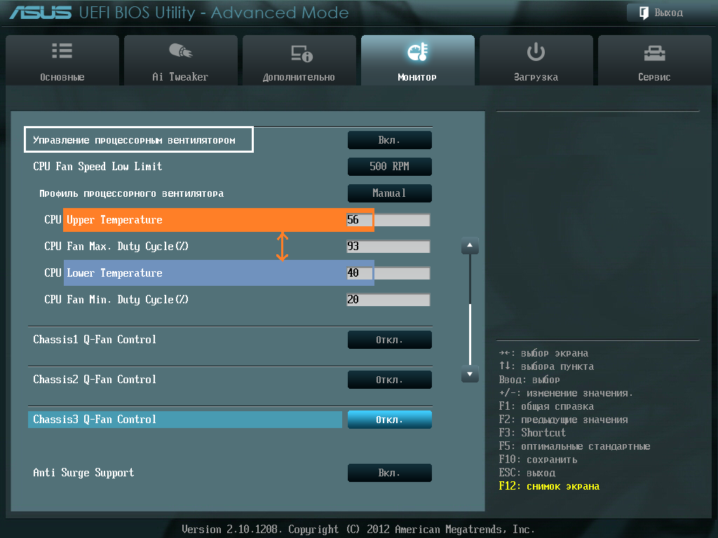 вопрос о настройке 4-pin процессорного вентилятора (TermalRight TY140) хотел настроить 500/700/900 из биоса. но не получилось. на скрине биоса диапазон "рабочих температур" между максимальными нагрузками и простоем : http://s1.hostingkartinok.com/uploads/images/2012/06/92416246eee2aeba6e0760c9f7126db6.png а сколько должен крутить вентилятор между такими границами ? (по факту и без FanХpert получается 1100/650 rpm игнорирует 500 , не ставит) - между границами должен крутить свой номинал ? ...по факту между порогами крутит столько же сколько и в пункте голубого цвета, как для минимума (650 rpm) и вообще игнорирует всё что ниже 650 хоть 500, хоть 300... значения ниже берётся исправлять только FanXpert (сначала калибрует, потом управляет сколько угодно, хоть на 200 пока не остановится, биос так не умеет...)