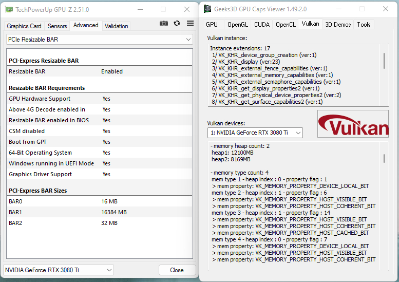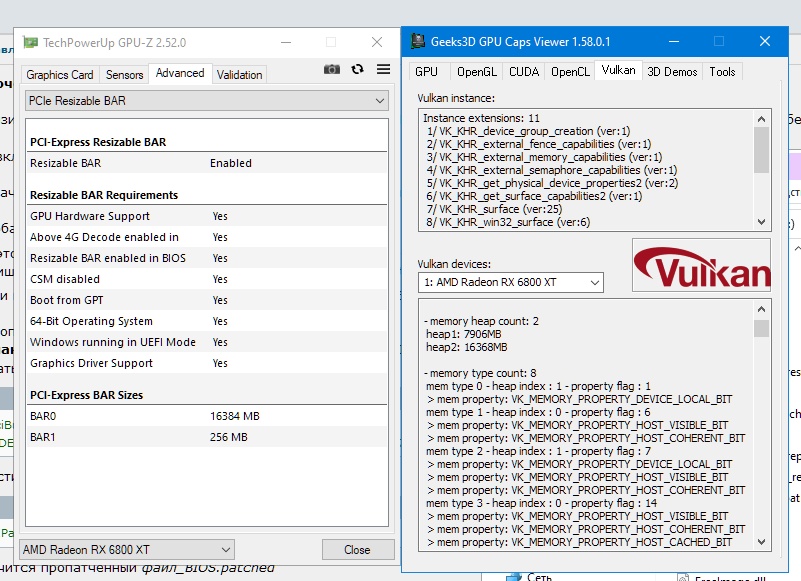 Как проверить, что ReBAR действительно работает? К сожалению, из того, что пишет GPU-Z, совершенно не следует, что драйвер использует ReBAR установленного размера. Например, в панели управления Radeon есть выключатель для ReBAR. Чтобы проверить, что происходит на самом деле, нужно запустить GPU Caps Viewer и на вкладке Vulkan найти heap, для которой есть memory type с атрибутами VK_MEMORY_PROPERTY_DEVICE_LOCAL_BIT и VK_MEMORY_PROPERTY_HOST_VISIBLE_BIT одновременно – это и есть память видеокарты, которую напрямую видно процессору (на скриншоте внизу это heap1 и mem type 4).