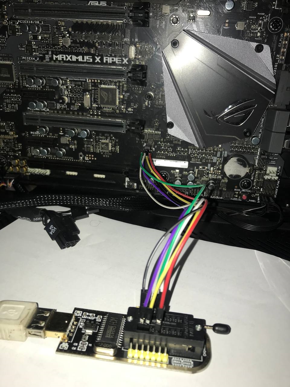 Из интересного, я же флешку сначала пытался шить просто через флешбек. Сделал дамп дабы посмотреть что там, почему не было запуска. Так вот, все прошилось (микрокоды и остальные настройки) но единственное что МЕ не выключился и фдлок не открылся. Таким образом получаем возможность шить платы типа apex ix, apex x программатором, где не подлезть прищепкой и не надо ничего пилить, паять и замыкать. Провода эти обошлись мне в 1$.