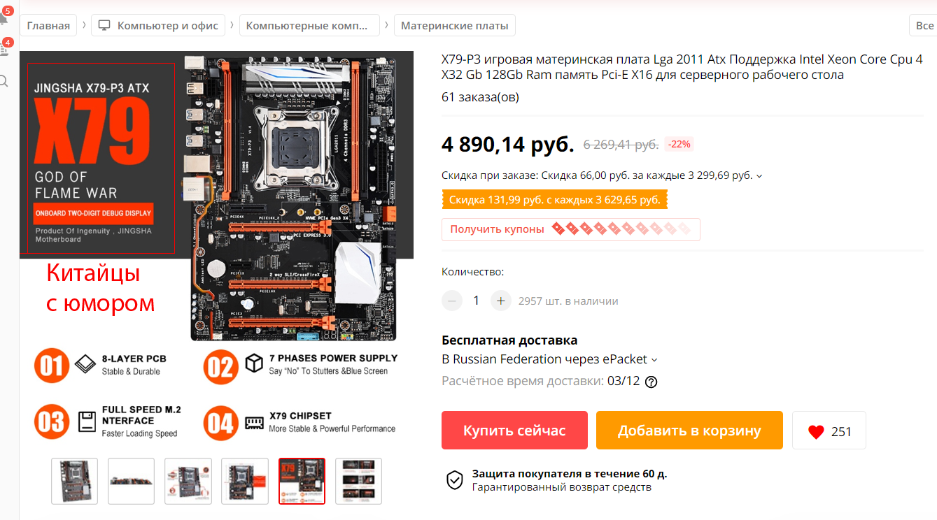 Отзыв единственный и нифига не хороший. Да и мат плата НЕ оранжевая а указана оранжевая. "Угол коробки порван после удара, край текстолита материнской платы согнуло. Больше похоже на краш тест а не на доставку. Тем неменее она работает. Мой набор DDR3L памяти не запускает совсем. Проверял все слоты по очереди двумя плашками DDR3, четырёхканал проверить пока нечем. SATA3.0 на матери 2 штуки - проверено. 04 Oct 2019 08:51"