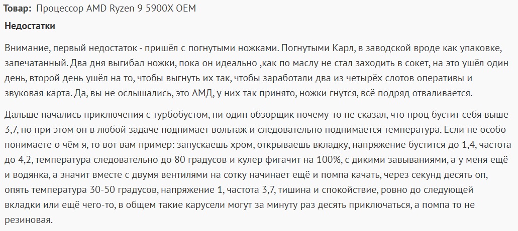 Отзыв явно фейковый. Ножки погнутые) Может у автора отзыва с руками не то) Я хоть противник AMD, но не до такой степени. Возможно крайне неудачный экземпляр платы или процессора. Мне и на интеловской связке похожий брак попадался, где материнка бустила напряжение до 1,2 - 1,3 В и всё грелось, ОС сыпала ошибками. Поменял всю связку на такую же и всё нормально стало. Напряжение под нагрузкой не поднималось выше 1 В.