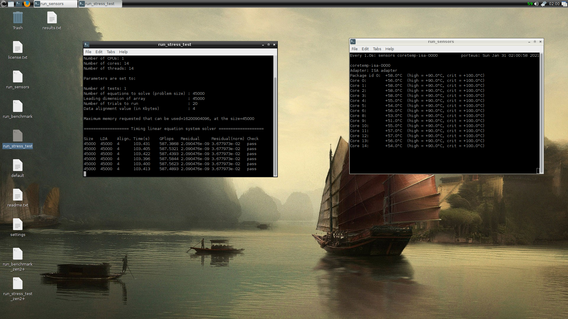 Видим стабильные 587 GFLOPS (в Win10 получал где-то 570 +/-). Всё-таки лучше тестить на специальной ОС, чтобы снизить побочную нагрузку приложений Win10 на процессор. Что ещё понравилось, линукс сам поставил драйвер на сетевую карту. Комплектный Firefox даже нормально и быстро сайты открывает.