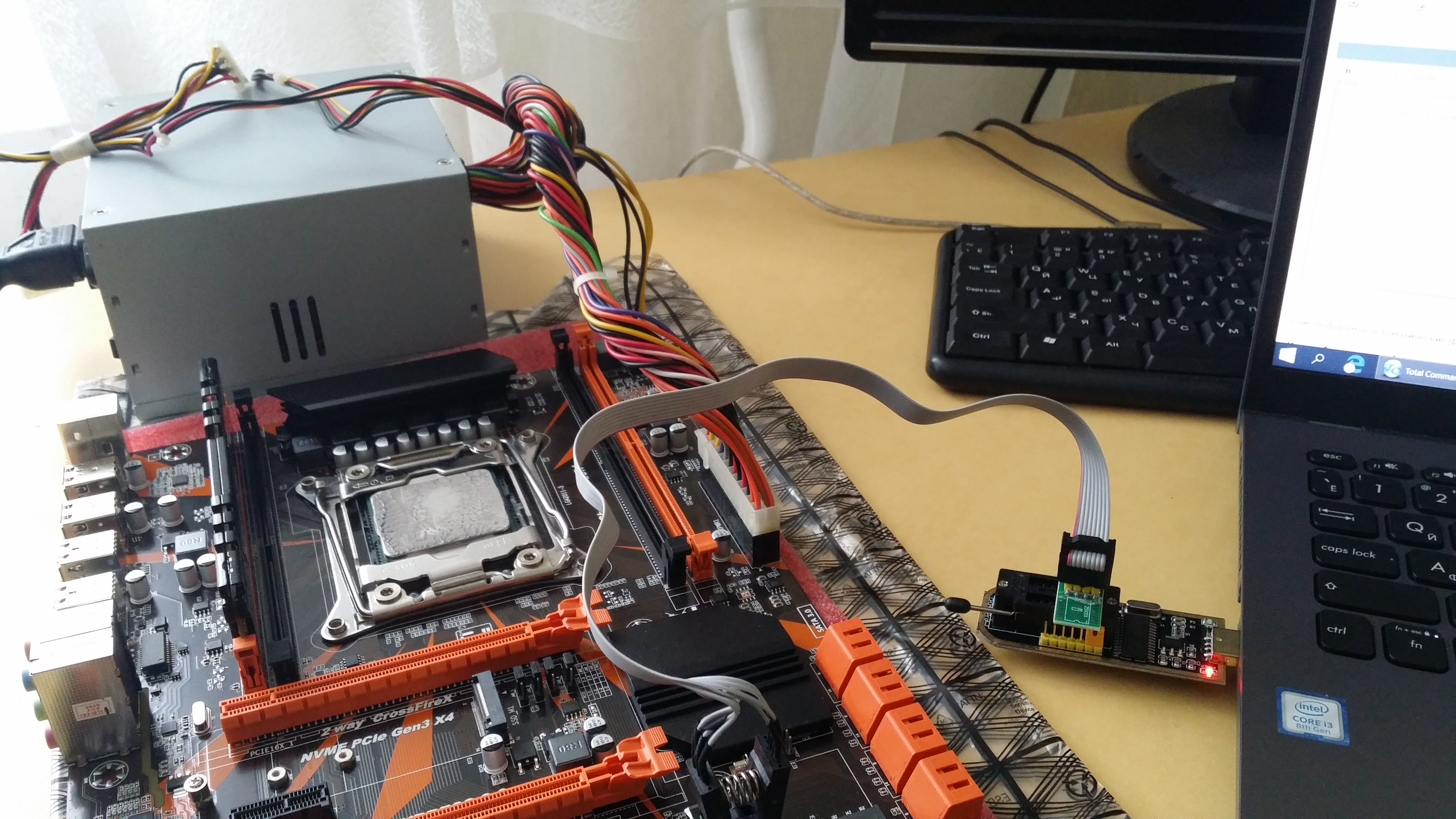 Именно это и подключено. BIOS шил Стоковый биос ревизии 1.31 от 04.20.2020 отсюда https://xeon-e5450.ru/socket-2011-3/plexhd-x99/ Возможно криво зашился. Прошить заново не получается. Скорее всего дело в прищепке, контакт паршивый.