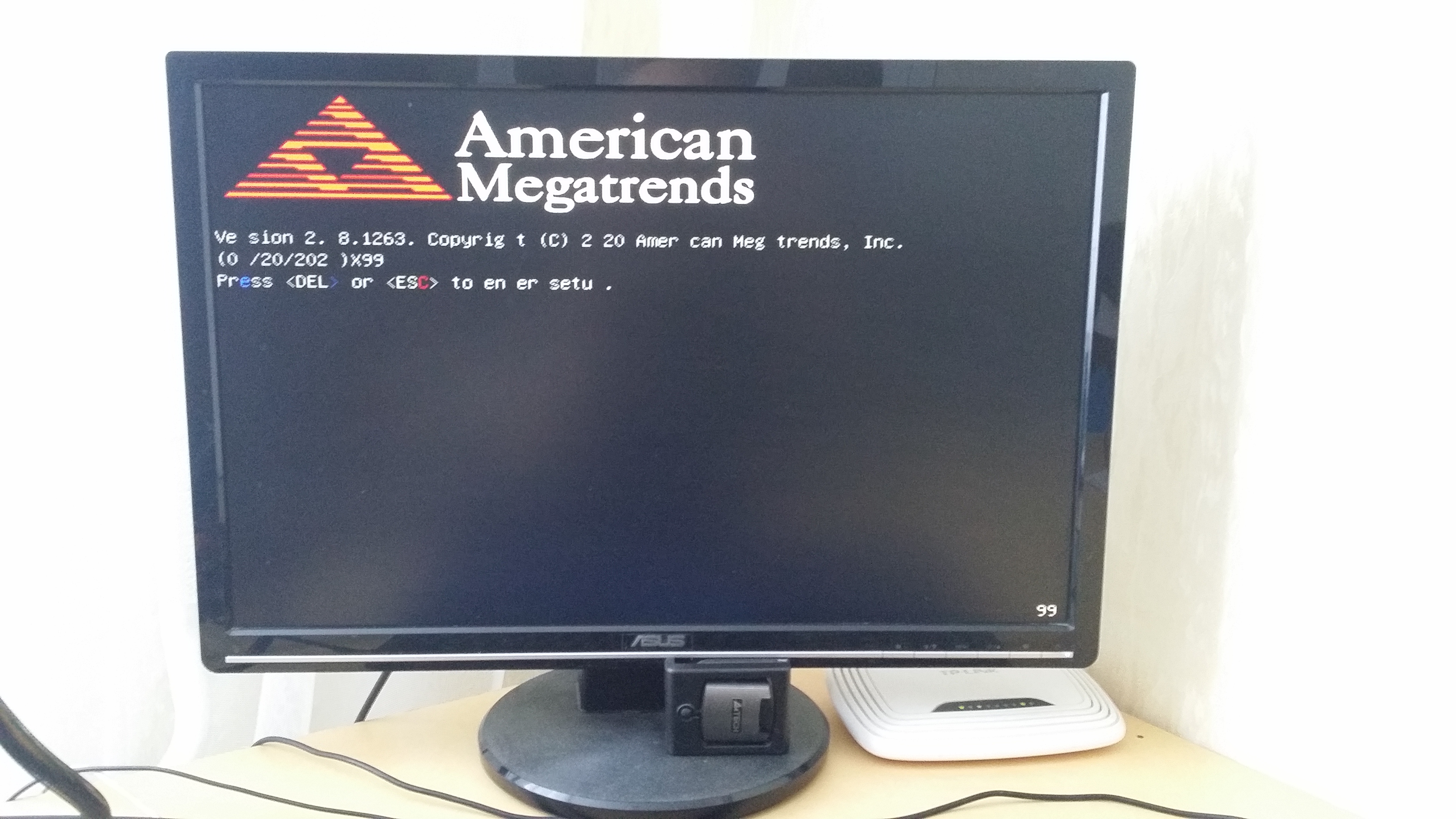 В общем прошил через прищепку бэкапом стокового БИОСа с сайта xeon-e5450. Запускаю, три раза пикает и зависает на пост коде 99 (на мониторе) и А9 (на самой мамке). Клавиатура usb не работает, ps\2 светится, но тоже не реагирует на нажатия. Вот что показывает (разноцветные символы, буквы через одну):