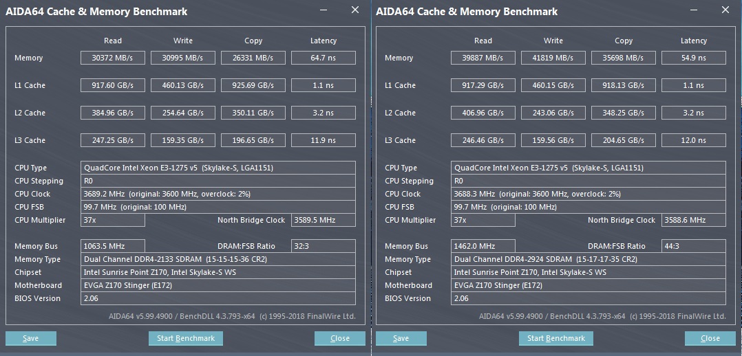 3000 МГц с ходу не взял, пришлось скинуть до 2933, но и в таком случае скорость чтения и записи выросла примерно на 30% и уменьшилась задержка примерно на 15%