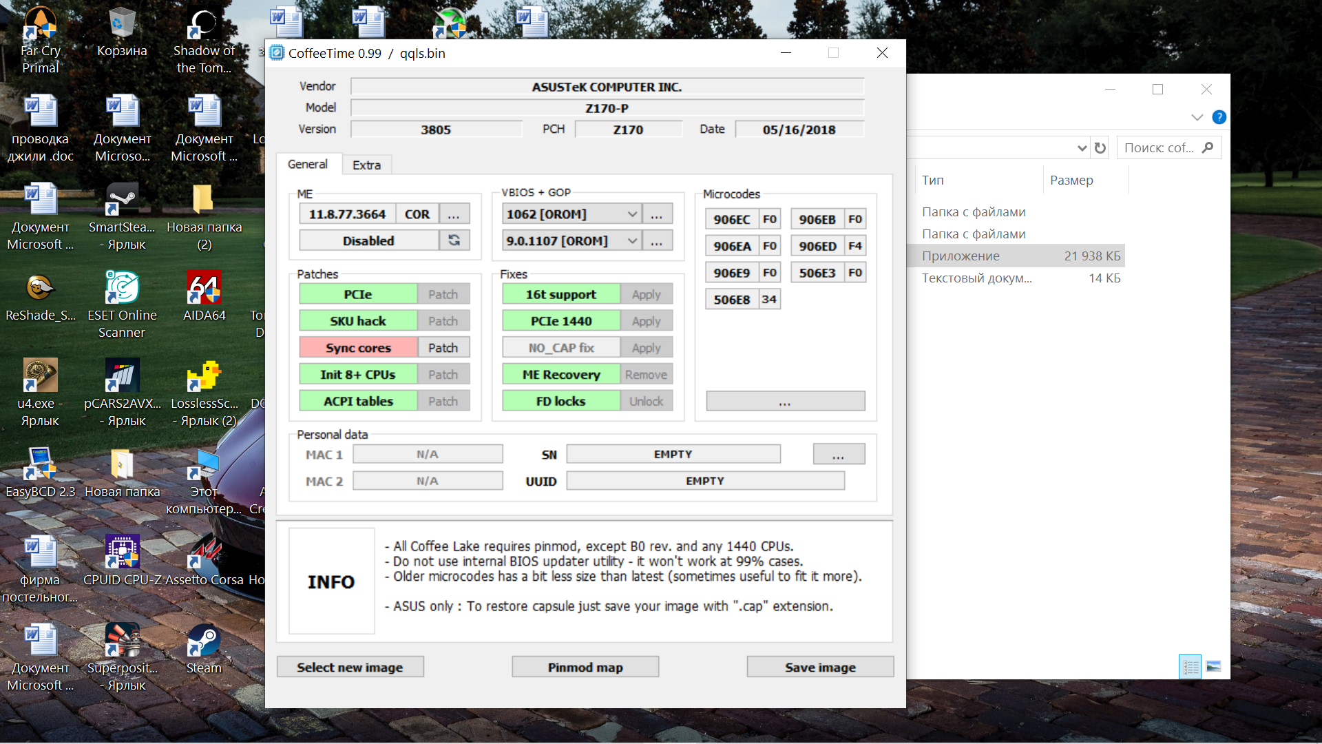 Запустите CoffeeTime.exe. На главной странице указаны особенности использования программы, контакты для обратной связи и предложение прочитать readme.txt для более полного знакомства с функционалом и содержанием версии. Для продолжения работы введите «1» и нажмите Enter. Откроется окно проводника; выберите скачанный с официального сайта биос и нажмите «Открыть». Также можно просто перетащить заводской файл прошивки на CoffeeTime.exe, используя Drag'n'Drop. #77