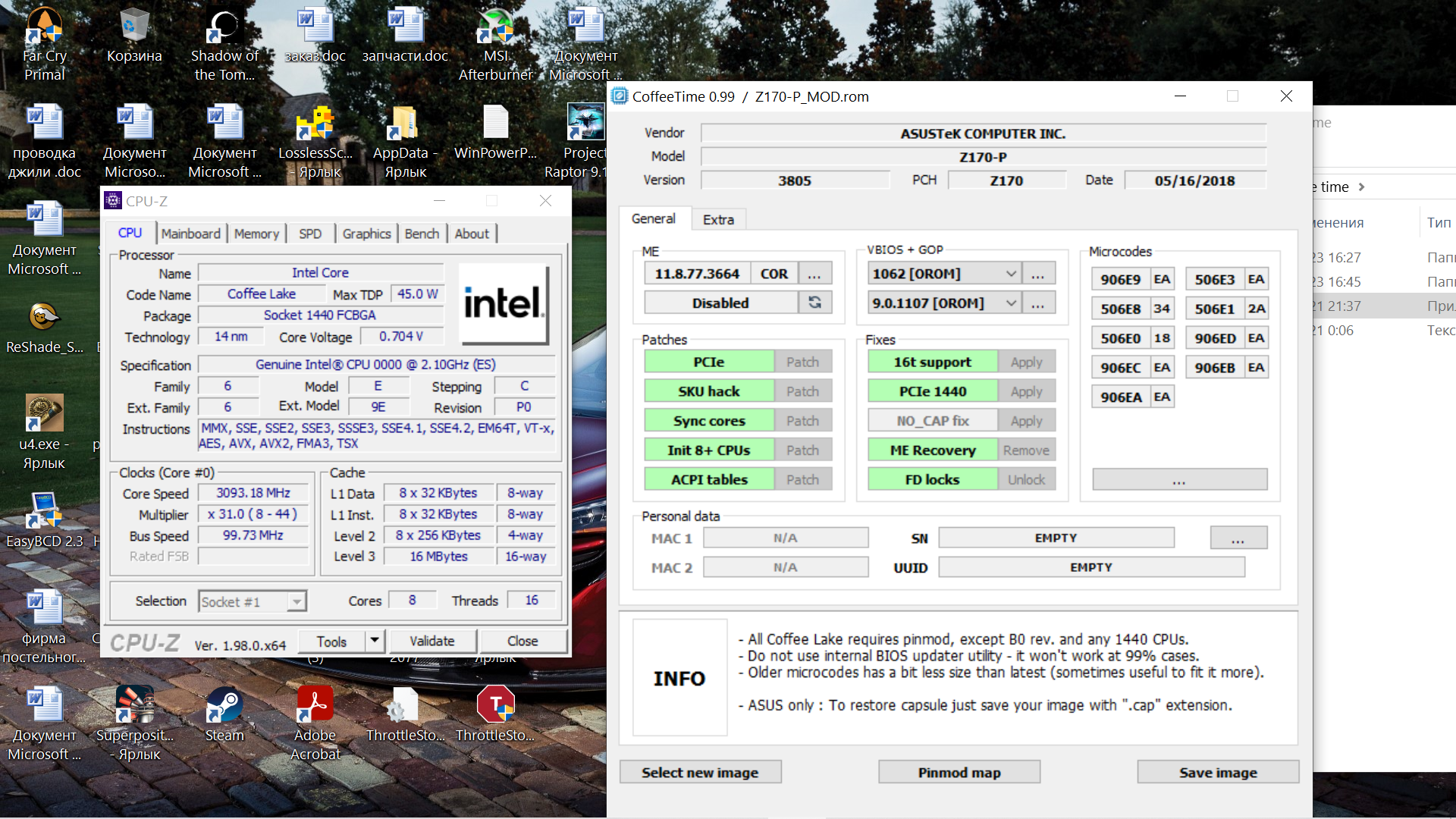 Имеется процессор i5 6400 и мат.плата ASUS Maximus VIII Hero, поставил i9 9900k ревизии R0. Использовал мод.биос, сделанный в CoffeeTime 0.85a, добавлял микрокод D2 для 906ED в advanced mode. Изолировал с помощью каптона, замыкал на процессоре перемычку для запуска https://i.imgur.com/MWLpLm0.jpg Прошивал с помощью программатора CH341A, используя AsProgrammer 1.4.0, сверку прошло при прошивке.