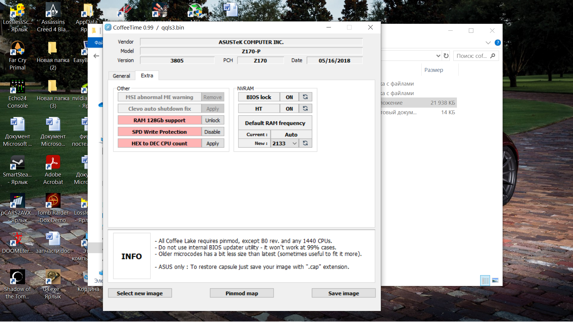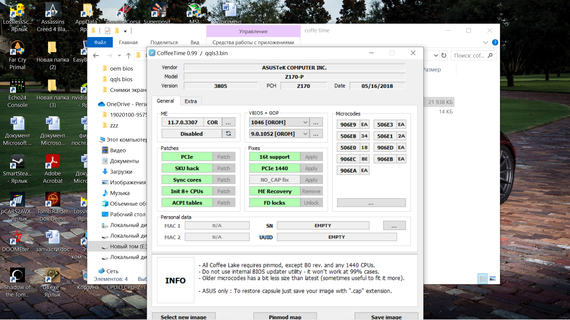 Запустите CoffeeTime.exe. На главной странице указаны особенности использования программы, контакты для обратной связи и предложение прочитать readme.txt для более полного знакомства с функционалом и содержанием версии. Для продолжения работы введите «1» и нажмите Enter. Откроется окно проводника; выберите скачанный с официального сайта биос и нажмите «Открыть». Также можно просто перетащить заводской файл прошивки на CoffeeTime.exe, используя Drag'n'Drop. #77