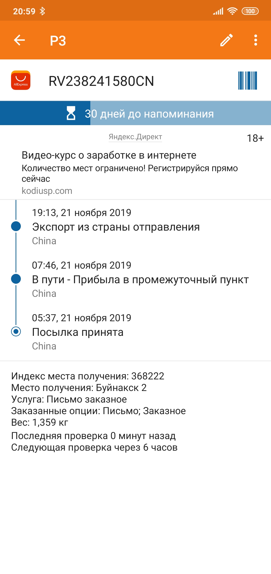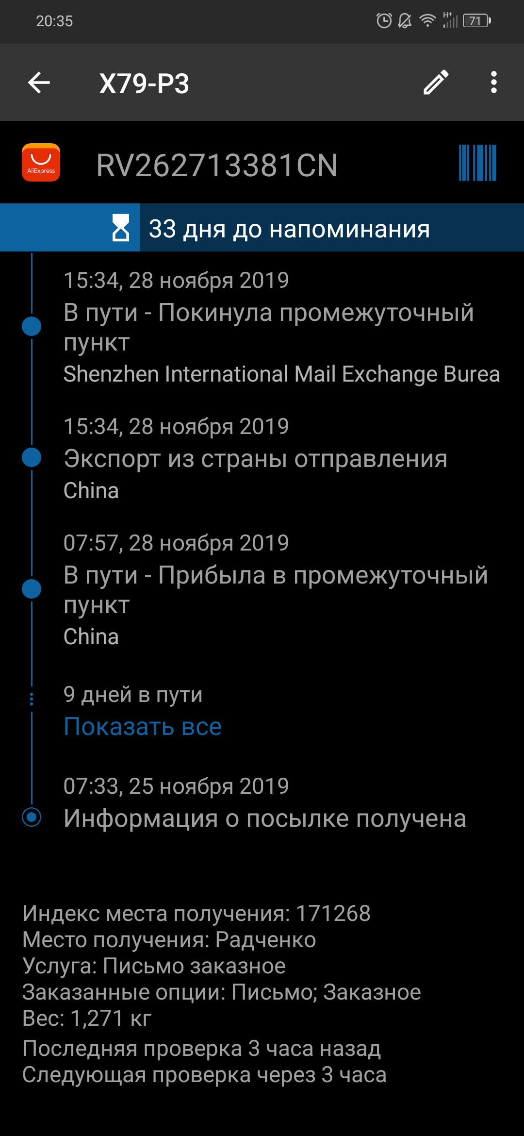 у меня так же. только с 28 ноября. мож как то трек поменялся? ты продавцу писал? p. s. но масса у тебя правильно отображается.