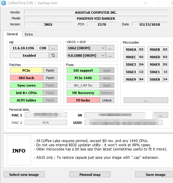 ikazantip писал(а): или можно Flashback'нуть её через флешку? естественно, с этого и надо начинать(биос лок в кофе0.99, желательно снять на всякий). ikazantip писал(а): Без программатора, полагаю не обойтись? Модификация материнских плат 100/200 для поддержки процессоров Coffee Lake 8xxx/9xxx #17671258 + в шапке 2. Дамп биоса и извлечение персональных данных + 5.4/5.5/5.3 + по аналогии(с адаптацией названий под свою маманю) Модификация материнских плат 100/200 для поддержки процессоров Coffee Lake 8xxx/9xxx #17316227 выбирай-перебирай