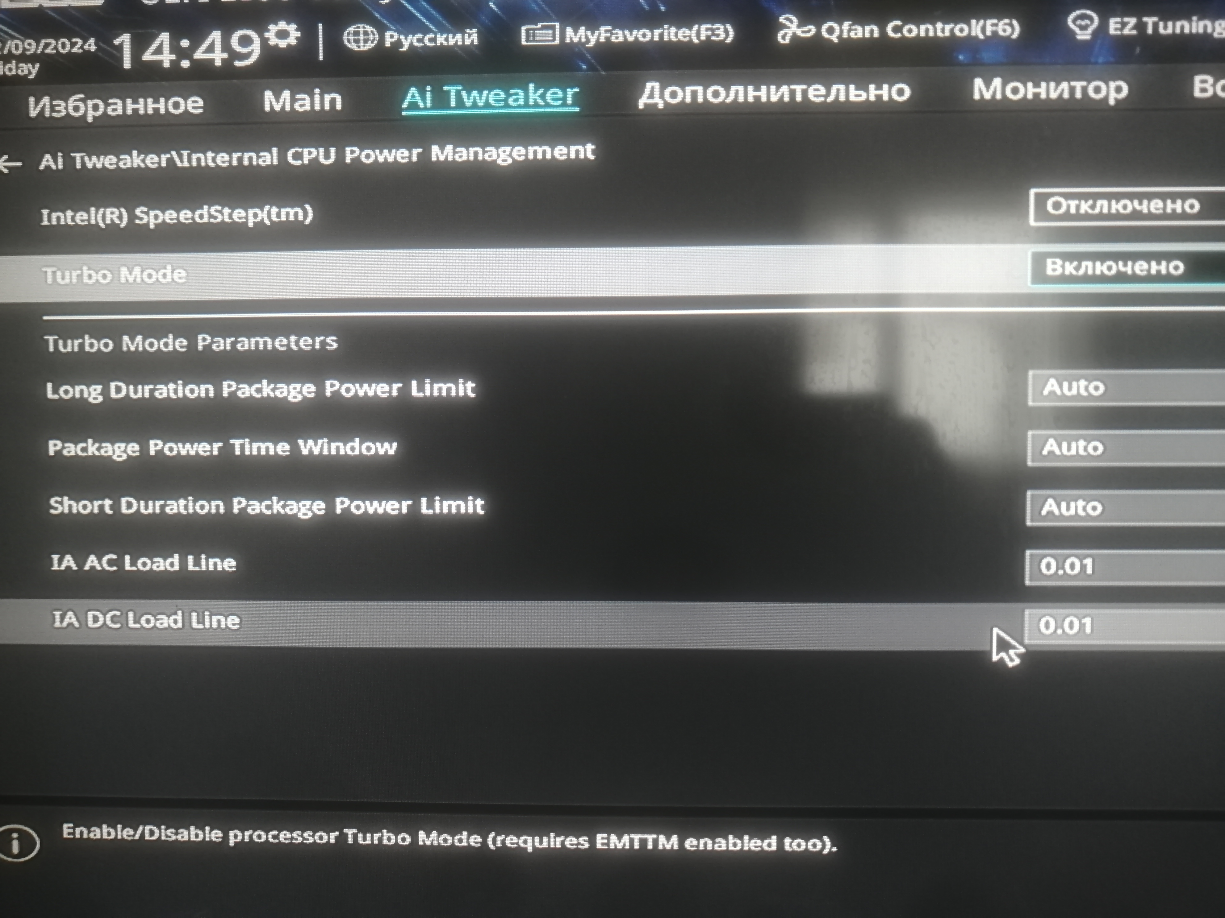 На платах ASUS, первый раз зайдя в BIOS Setup, установите значение «0.01» для параметров «IA AC Load Line» и «IA DC Load Line».