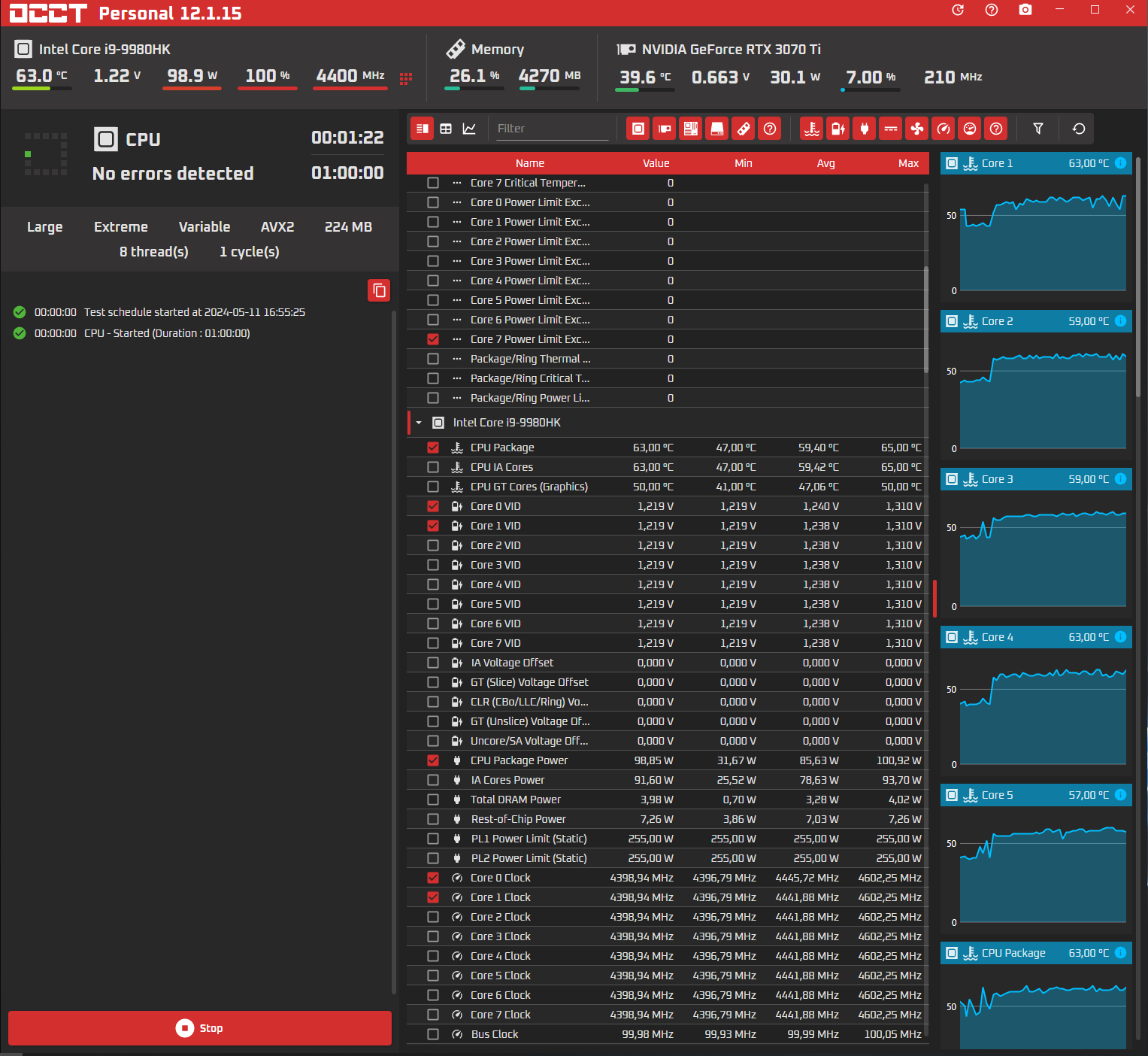 MSI Z370 Gaming Pro Carbon AC + i9 9980HK SRFD0 + БП Cougar GEX850. Я мог бы много текста написать про то как я уже разгонял данный камень, но могу лишь сказать одно. Все упирается В TDP 95-100W. Вообще в целом разницы не имеет, если врубить Multi-Core Enhancements или же прибегнуть к низкоуровневому способу с ручным выставлением PL1 и PL2. Но меня беспокоит то, что при любом значении LLC у меня напруга проца понижается до 1.21-1.22. Причем такое поведение я заметил только при работе с OCCT. Если врубить FPU тест через аиду, то напруга не падает как бы... Итог: 8\16 + 4.6 ГГц 1.3v, в стрессе частота понижается до 4.3-4.4 ГГц и в играх ровно точно также; 8\8 + 4.6 ГГц 1.3v, в стрессе точно также, но в играх держит 4.6 стабильно(редко просаживается до 4.4 на долю секунды) На линухе соответственно ловлю зависоны в играх; 6\12 + 4/8 ГГц 1.3v в стрессе точно также, но в играх держит 4.8 стабильно. На линухе соответственно ловлю зависоны в играх.