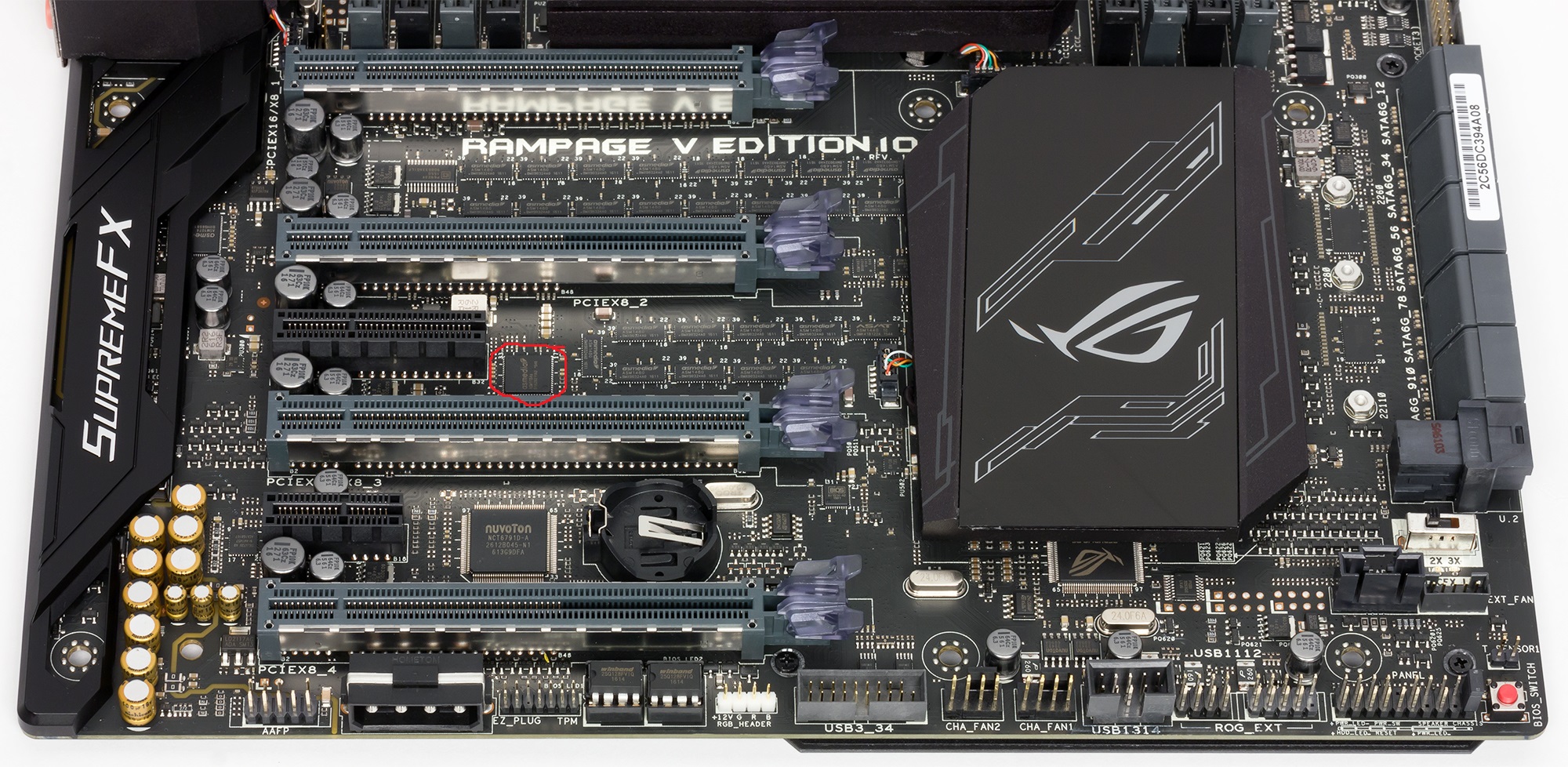 Первый (от процессорного разъема) и третий слоты с форм-фактором PCI Express x16 переключаемые и могут работать в режимах x16 и x8. Для переключения режимов работы слотов используются переключатели линий PCIe 3.0 ASMedia ASM1480.