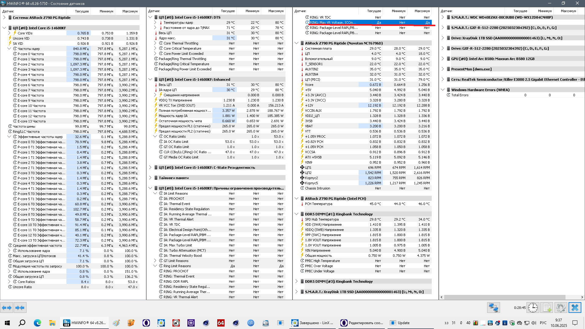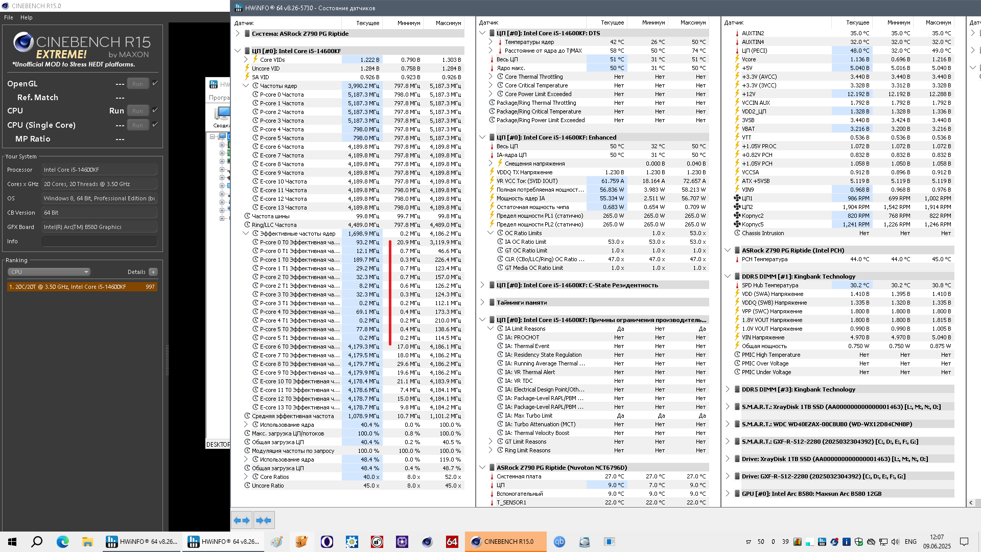 а сколько примерно должен набирать 14600кф в этом бенче(CR15) да и самого начала в HW ограничение производительности по RING: Max VR Voltage, ICCmax, PL4 я не понял как это исправить правильно в биосе.и где конкретно.у меня пропало оповещение,когда я в FIVR изменил ring voltage offset с авто на 40. можно так или надо где то подругому?