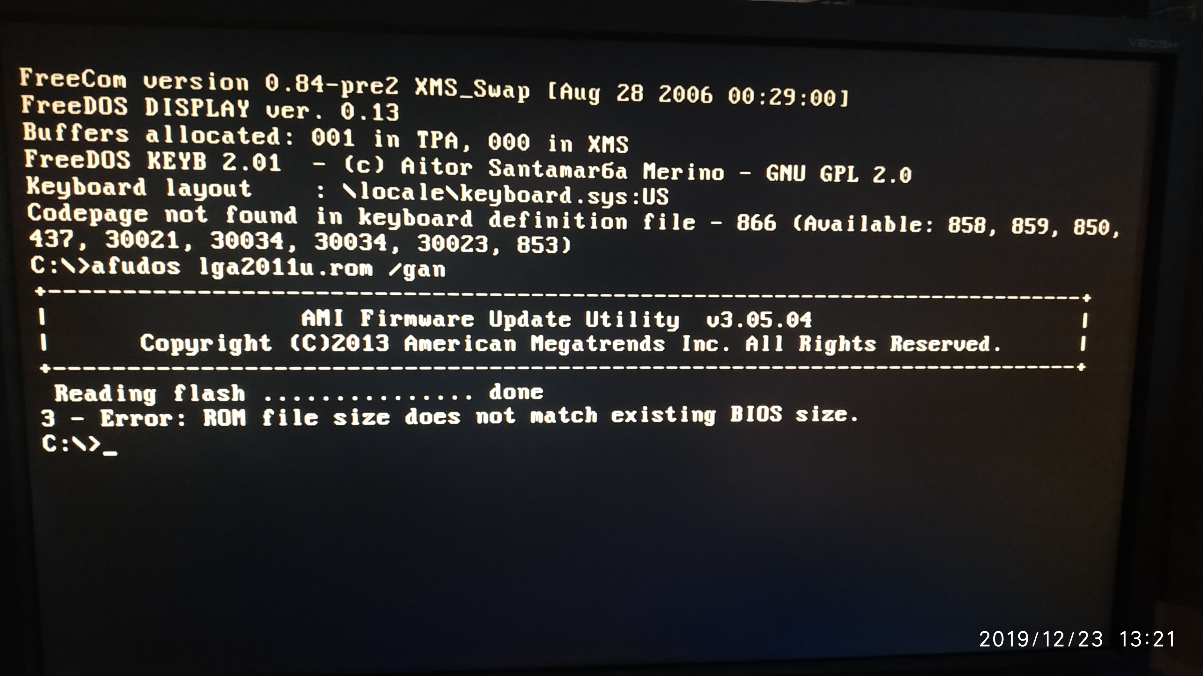 всем привет. собрал сборку на 1620, мать х79р3, 16гигов оперативки. решил сразу прошить биос по инструкции из видео с канала "купи дешево". скачал биос (папку "закинуть на флешку") форматнул флеху программкой руфус и закинул на нее все файлы, отключил хард и м2, вставил флешку ввел команду afudos lga2011u.rom /gan . выскочила строка копирования а затем ошибка 3-error: ROM file size does not match existing bios size. что она значит и как прошить биос чтобы выставить тайминги? родной биос запускается и работает.