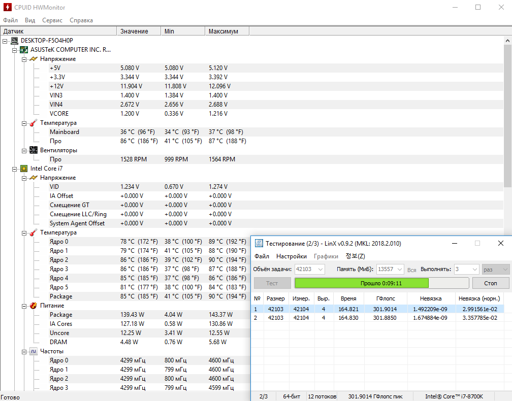 ну это ж у вас при 1.2, а у меня при 1.25, вот и разница + температура в комнате... а вообще я сейчас все подстроил, 4800мгц, поставил LLC7, теперь напряжение в покое 1.248, в нагрузке подымается до 1.28, температура максимально замеченная в LinX была 85, в prime95 и OCCT и того меньше, везде стресс тест по часу прошел без ошибок, думаю попробовать LLC6, но там в нагрузке просадки до 1.232...