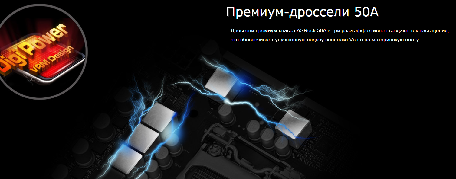 Премиум-дроссели 50A Дроссели премиум-класса ASRock 50A в три раза эффективнее создают ток насыщения, что обеспечивает улучшенную подачу вольтажа Vcore на материнскую плату - Дроссели Premium 50A Power Choke