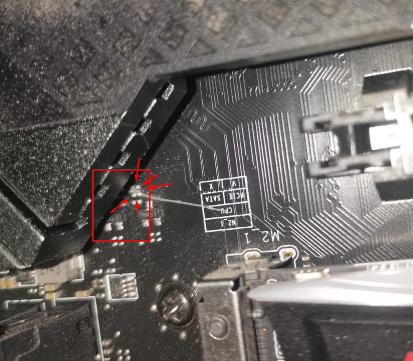 Ребят , всем привет ! Хочу рассказать свою историю , спросить совета и подчеркнуть инфы как быть дальше . Начну сначала : пришел поздно вечером уставший с работы , нужно было снять ВК и повезти на обмен . ВК palit gamerock 3070ti , тварь , правым концом застряла в заглушке на матплате msi z-690 edge wifi ddr 4 . Крутил и так и сяк ни в какую , часть ВК в pcie слоте идёт на излом естественно , корпус большой увесистый phanteks ethoo evolve tempered glass , кое как кладу на диван , весь уже в оге и в поту . Давлю на заглушку шевелю карту ноль эффекта. Нахожу вариант , надавить на заглушку колпачком ручки или прорезиновым краем стилуса, похер , не помогает . Беру малую отвёртку давлю на заглушку - она ломается , карта свободна . На материнке вот это вот :