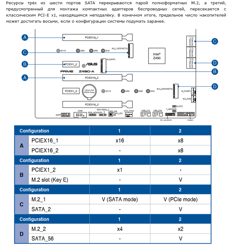 Расписано. но не понятно почему если использовать М.2_2 как х4 почему отключаются 2 SATA порта? Если вставить Wi-Fi модуль то отключиться один PCIe x1 слот. и т.д. Ведь у моста 24 линии PCIe и далеко не все ещё задействованы. Что за непонятная тусня? Считаем: 2 слота М.2, 2 x4+x4, слота PCIe x1+x1, слот PCIe x4, Wi-Fi это x1, Сетевуха x1. Итого 16 линий PCIe задействовано. 8 ещё свободно. Или даташит на чипсет чего то от нас скрывает и "не всё так однозначно"(с)? Я ещё понимаю такую тусню на мосту Z77. Там всего 8 линий PCIe и на все желаемые устройства одновременно не хватает.