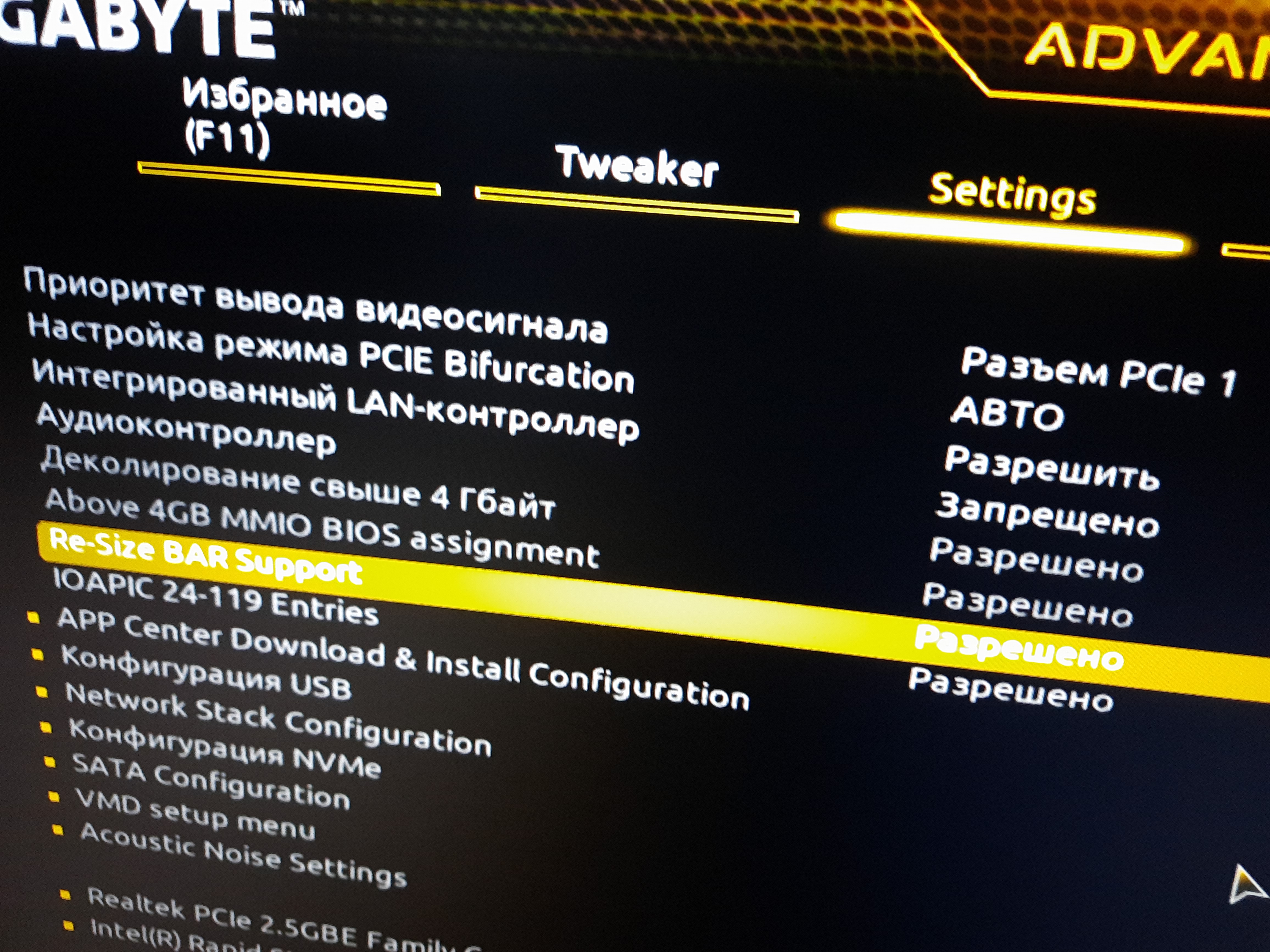 Проблема - в BIOS ни в какую не появляется настройка Re-Size BAR support, вообще нет такой строки, даже серой-неактивной. Гугл говорит, что она должна появится сразу под Above 4G Decoding после ее включения, но у меня нет. BIOS сбрасывал - не помогло.