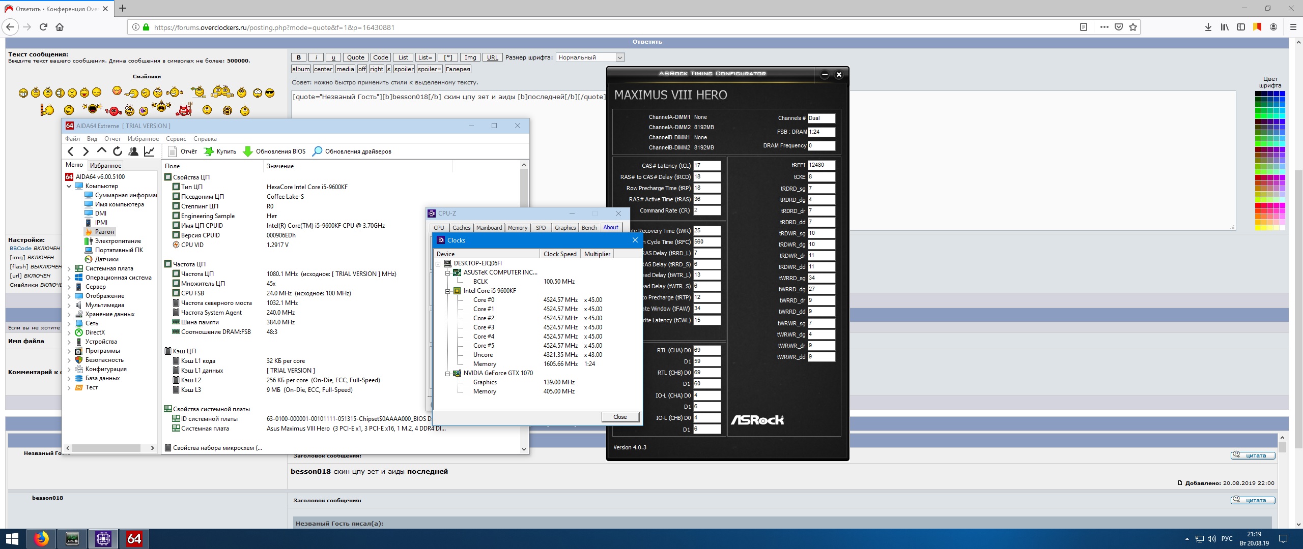 Всем привет! Ребят подскажите пожалуйста по такому вопросу: хиро 8 + 9600 кф, биос 3802 последний с сайта асуса (прошито программатором), все запускается и работает, но почему то в асрок тайминг конфигураторе не пишется частота памяти, а в аиде частота фсб 24 всего. Пробовал и множку крутить и фсб, максимум меняется отношение шины и частоты памяти. По разгону пробовал убирать все энергосберегайки и частоты память и первые тайминги руками ставить, результат тот же. Вин 10, не переустанавливал. В чем может быть трабл. Напруги тоже пробовал руками выставлять.