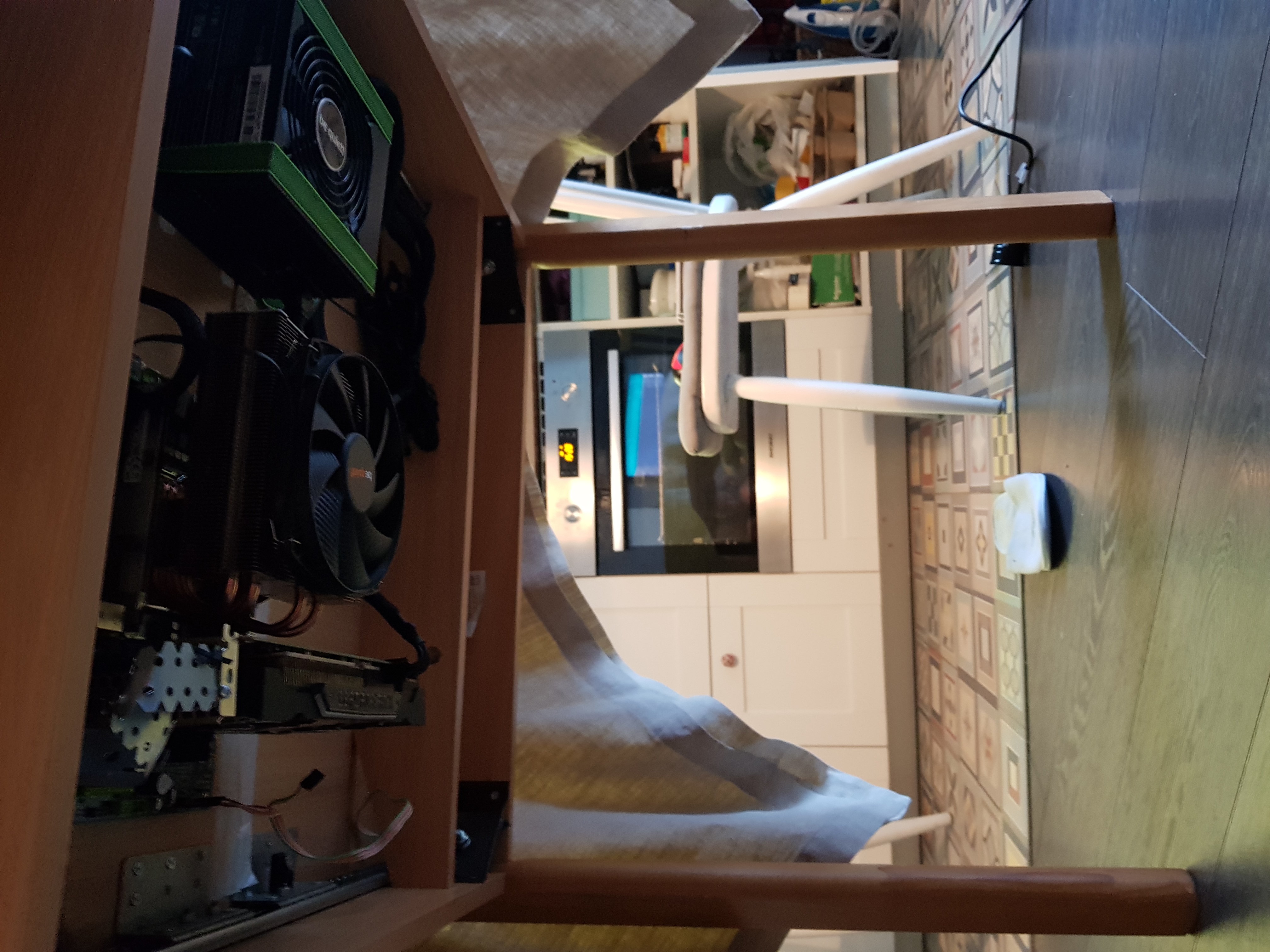 Размер и дизайн квартиры накладывают ограничения! 7 лет без компа жил, но теперь вариант нашелся)) Стенд, конечно, открытый, но теплая подушка скапливается в этой нише, поэтому можно будет потом вент отверстия по бокам сделать. Внешних проводов только три - питание бп + питание моника, hdmi. Остальное wireless. Плюс, блок питания дует на врм и в зазор между столом и материнкой