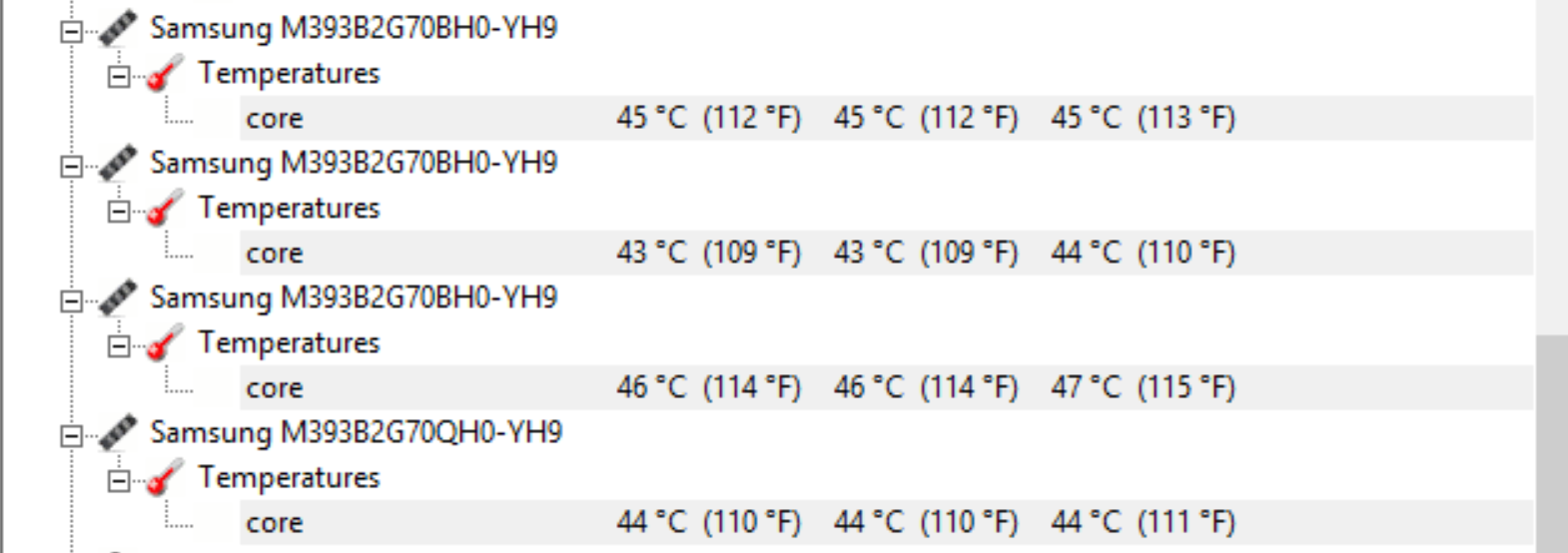 А мониторинг есть? Я просто свои планки самсунговские без радиаторов полапал немного пальцем в нагрузке и там всё кроме регистра холодное совсем, на том уровне что можно спокойно палец держать, хоть на 1333 хоть на 1866. А вот регистр греется... прилепил на него мелкий радиатор (с чипа памяти видеокарты) на термоклей (больше из любопытства чем ради практической пользы) и даже так палец на нем держать невозможно. Вообще с серверной памятью ИМХО вопрос охлаждения интересный, во всех серверах что видел весь объём обычно прилично продувается, а память - особенно. Т.е. отдельные вентиляторы, направляющие итд для охлаждения памяти - совсем не редкость. Так что модули вполне могут быть рассчитаны именно на такое использование...