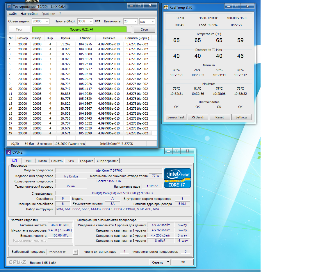 Парни, приветствую. Апгрэйдился недавно, решил подразогнать свой 3770К, БИОС обновил пока до 1.9, выставил на ядра частоты Per Core 4.4 4.5 4.6 4.7, зафиксировал множитель 1.125 и Additional Turbo Voltage +0.020V, остальное в дефолте (см. фото (флэшку куда то похерил)), ну и память выставил на 1600. LinX проходит (см. скрин). Считается ли данный разгон "грамотным" и почему в LinX частота в основном 4.4Ггц, потому что работает многопоточность?