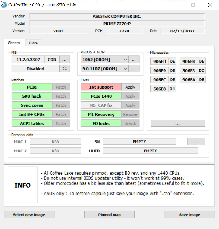 У меня ASUS z170m plus и изначально я делал Coffee mod под мутант QNCT. Потом QNCT был продан, вместо него был куплен i5 8600k и, поскольку микрокоды у них идентичны, я не стал делать еще одну модификацию BIOS - все заработало и так. А теперь я осознал, что в процессе первоначальной модификации под QNCT я отключил intel ME. Правильно ли я понимаю, что в случае модификации под i5 8600k можно взять bios с сайта ASUS и просто добавить поддержку нужного микрокода, без модификации ME и VBIOS вообще? Или их нужно как-то модифицировать?