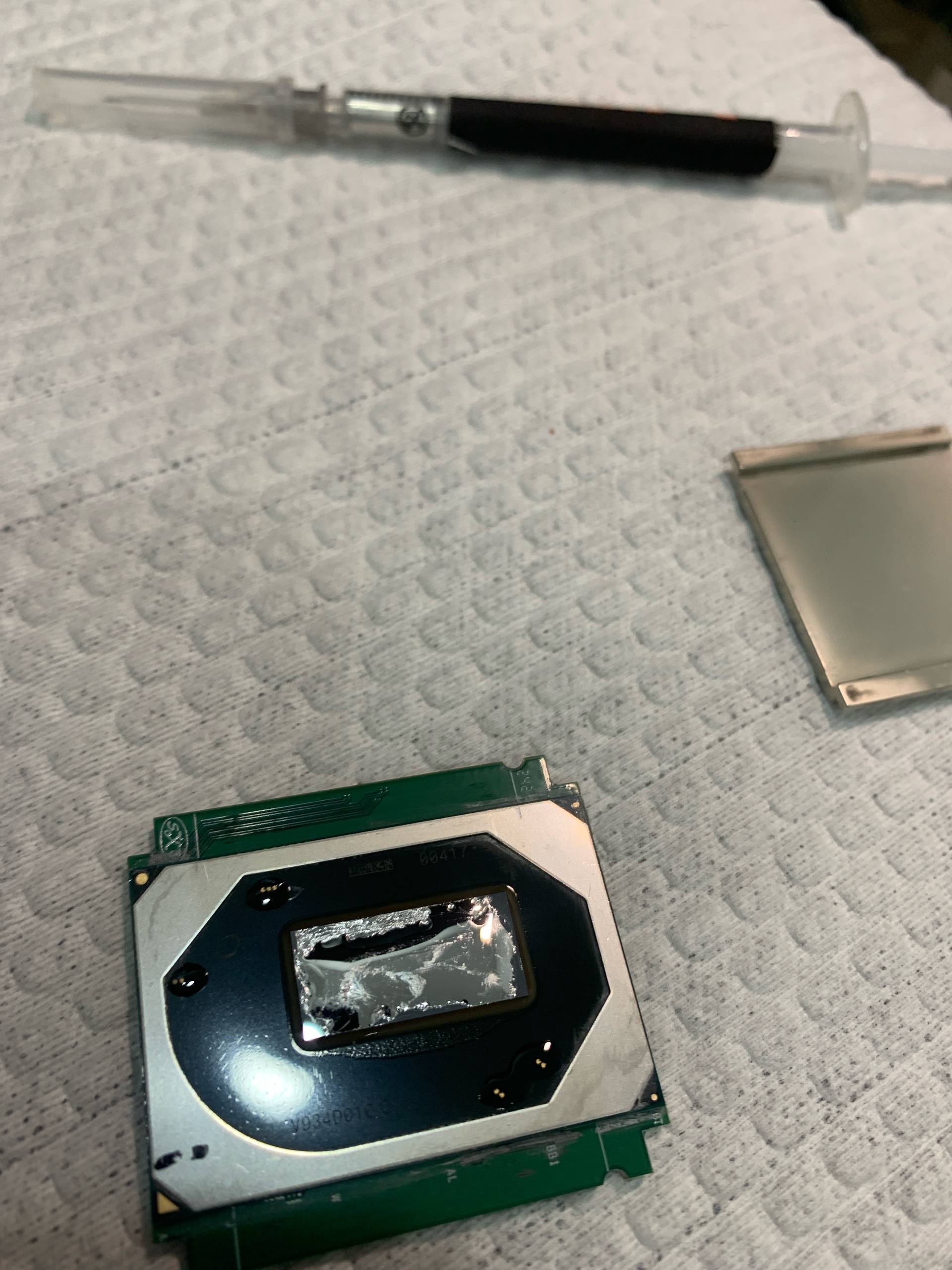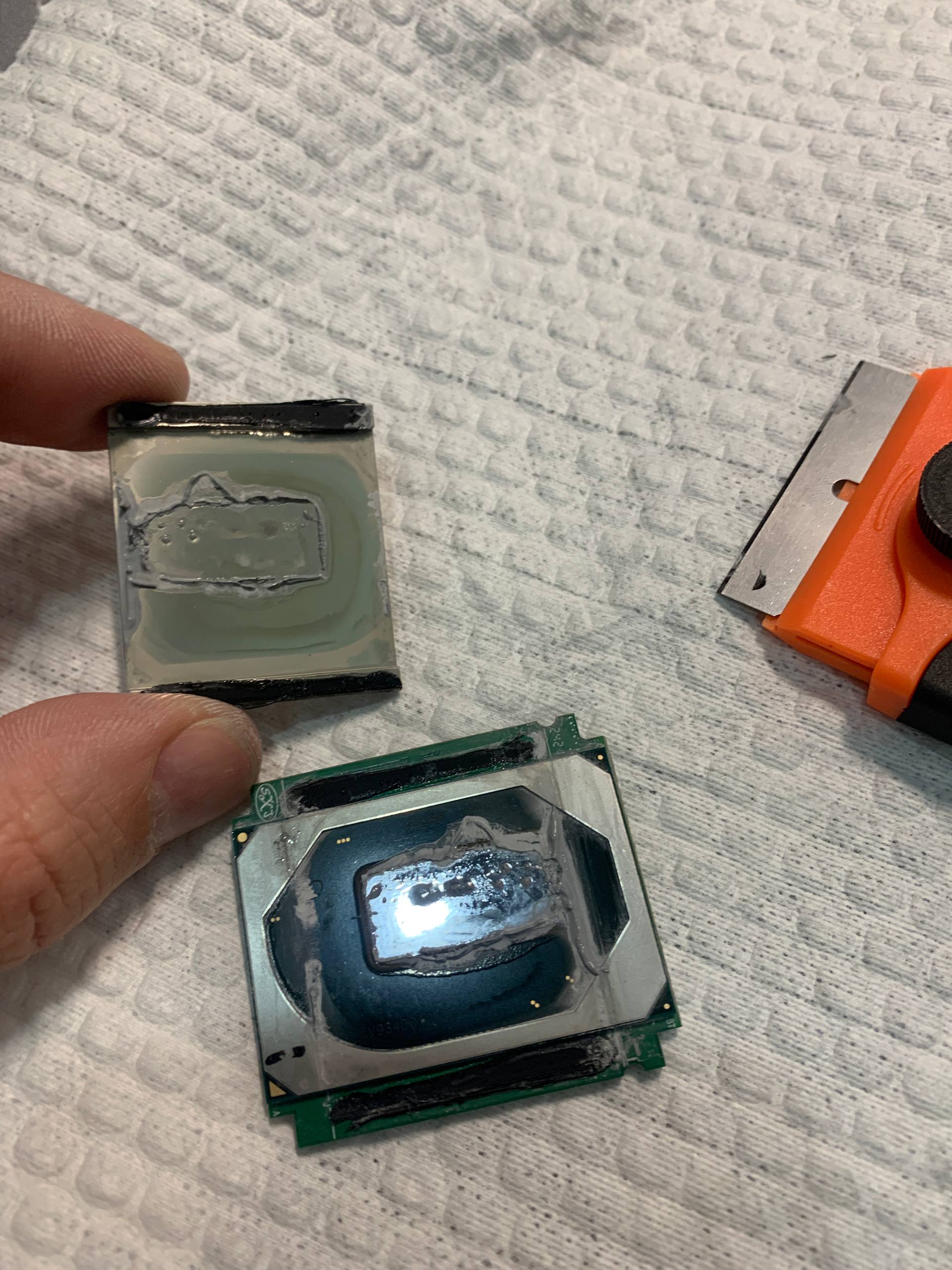 Всем привет, есть у меня 2шт qtj1, и тот что под 3х секционной водой, начал летать до 90градусов, в любой более менее адекватной нагрузке, думал что воду пора перезаправлять, поменял и не выиграл ни одного градуса, долго я откладывал, пришлось скальпить, все оказалось очень просто, на фото все видно, господин Ляо как обычно налюбил, должен быть жидкий металл, по факту обычная дешманская термопаста которая деграднула, поменял на жидкий металл Фрост майнинг, заизолировал контакты лаком, нанес жм легко, главное обезжирить поверхность, посадил на герметик крышку, 150w потребления теперь совсем не чувствуется, теперь точно понятно, что надо скальпить и второй