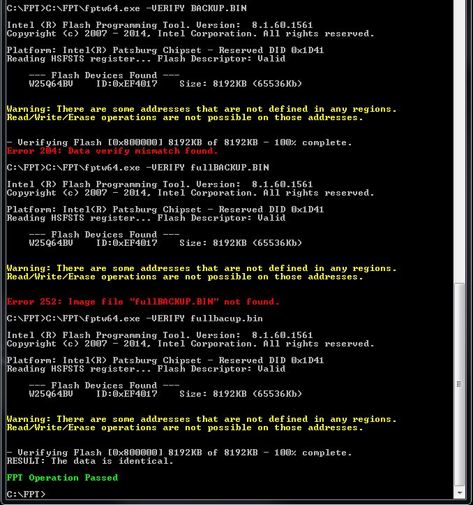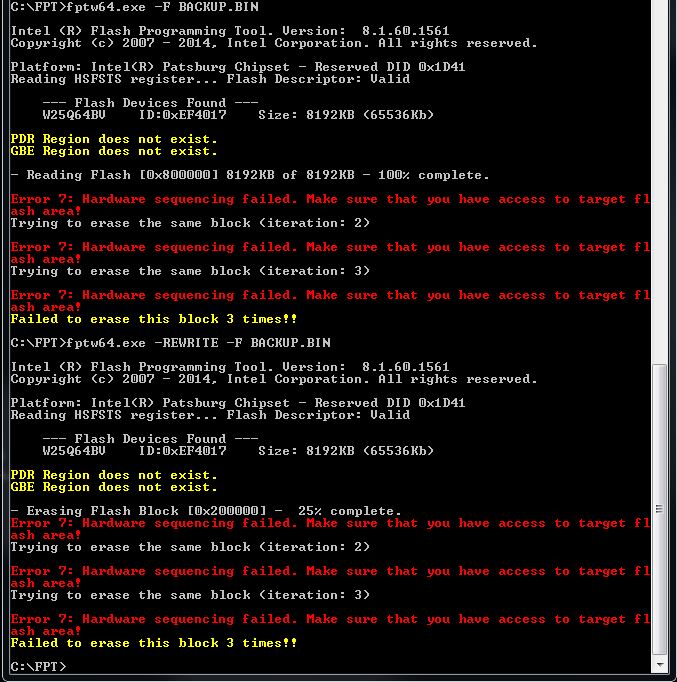 Ну, допрошивался я похоже. fptw64.exe -F BACKUP.BIN Выдала те же ошибки, а C:\FPT>fptw64.exe -REWRITE -F BACKUP.BIN Походу затёрла первые 20000 килобайт и так же выдала ошибки. Я правильно понимаю, что после ребута меня ждёт кирпич и программатор с ноутбуком? Походу там какие то другие блокировки на ту часть где BIOS.