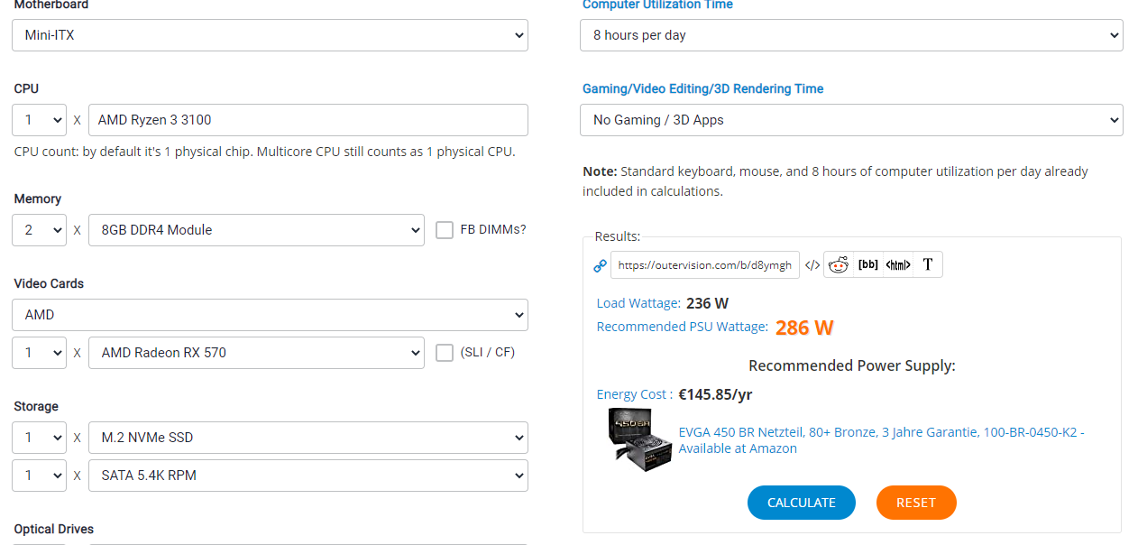 БП заменен на старичка 2015 года Corsair VS Series™ VS550 — блок питания 550 Вт, сертифицированный по стандарту 80 PLUS® White Его должно хватать. На калькуляторе посчитал (см. скриншоты), моя сборка есть 286 ватт. Проблема осталась. БП новее не нашел. Брать новый финансов не было.
