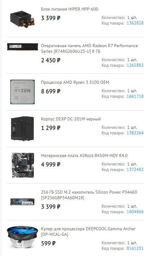 Процессор AMD Ryzen 3 3100 OEM Корпус DEXP DC-201M Блок питания HIPER HPP-600 600w Материнская плата ASRock B450M-HDV R4.0 Оперативная память AMD Radeon R7 Performance Series [R748G2606U2S-U] 8 ГБ 256 ГБ SSD M.2 накопитель Silicon Power P34A60 [SP256GBP34A60M28] Кулер для процессора DEEPCOOL Gamma Archer [DP-MCAL-GA]