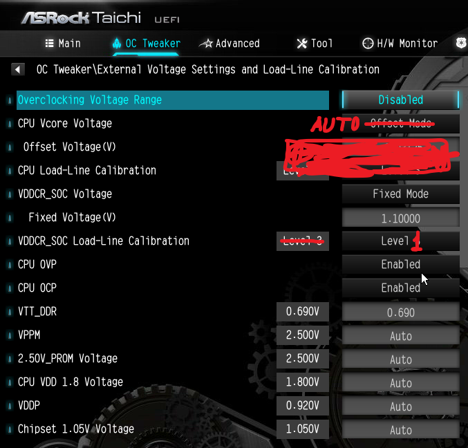 Можете сделать скрин биоса, вкладки Tweaker OC, a также скрин подменю External voltages