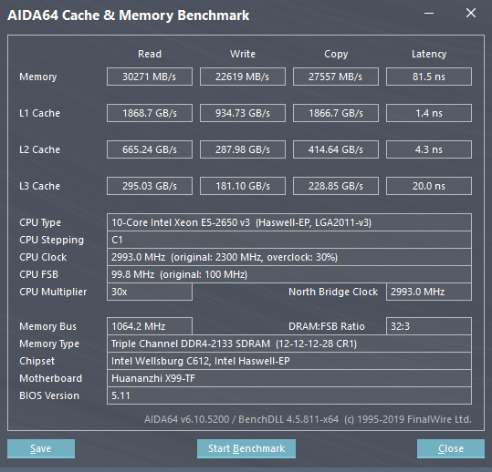 Добрый день! Вот собрал себе на Хуанане Х99-TF +2650v3+ 24 GB DDR4 Kliisre вроде все работает, но вот результаты тестов не дают покоя)) У всех, смотрю, чтение/запись памяти в 2 раза больше, чем у меня. Посмотрите на результаты - это может быть из-за того, что у меня трехканал? Или еще что то? Тайминги только основные в БИОС выставил, вторичные не трогал.