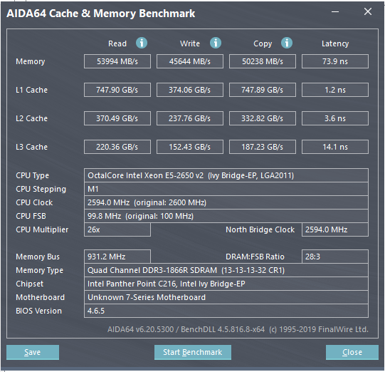 приветствую, просьба к владельцам e5 2650v2, скиньте пожалуйста тест кэша и памяти с аиды