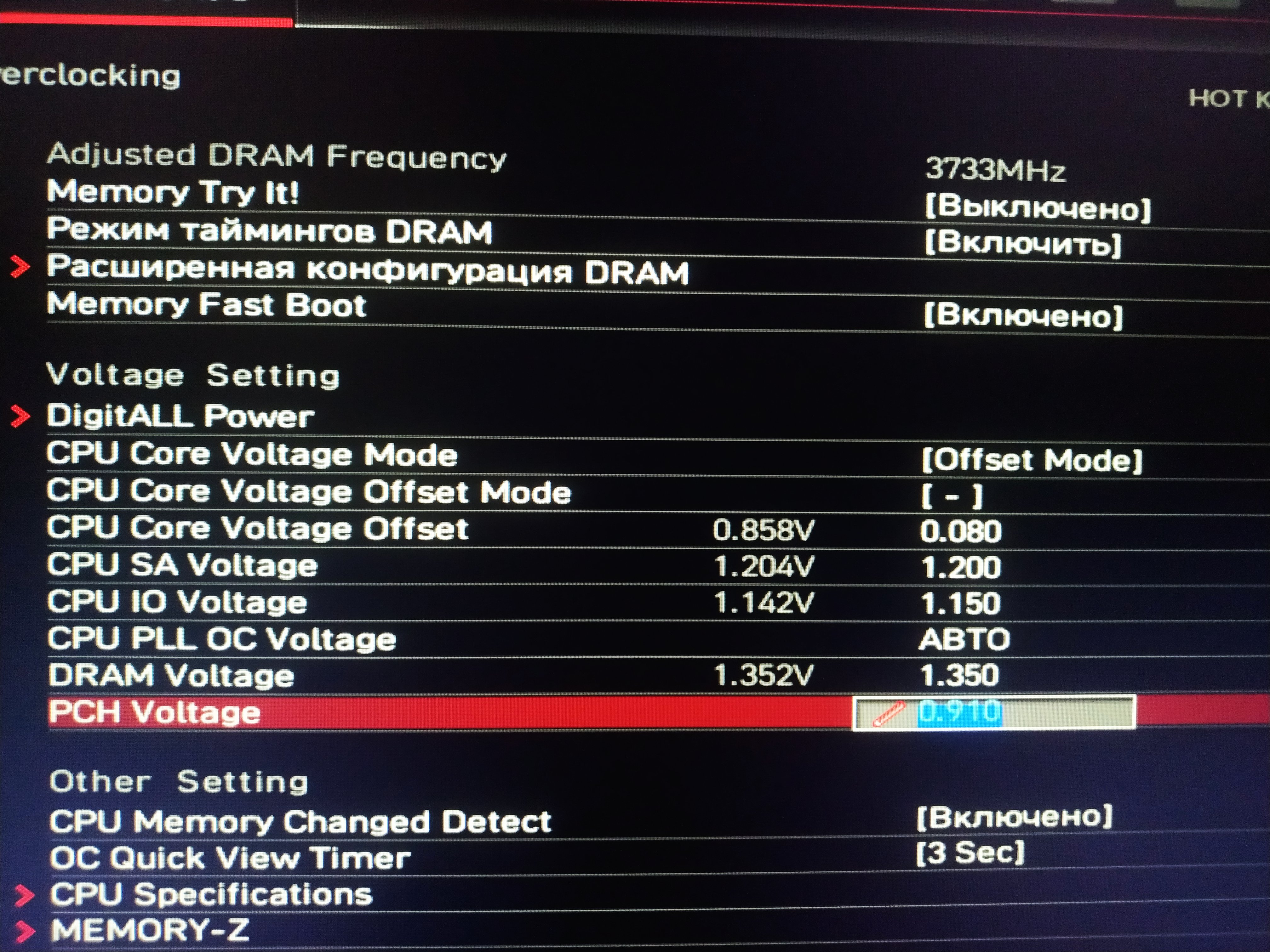 Господа, скажите пожалуйста, какое номинальное напряжение чипсета Z490? Хочу сделать андервольт, но не знаю от какого напряжения отталкиваться. Напротив PCH Voltage не показывает текущее напряжение в режиме avto. Диапазон регулировок 0.850-2.000 V, начиная с 1.210 до 2.000 v красная зона. Сейчас поставил 0.900, снизил температуру на 12 градусов. Если не ошибаюсь, то номинальное напряжение должно быть 1 В. Так же ставил 0.850, ПК работает, но думаю будет вылетать bsod.