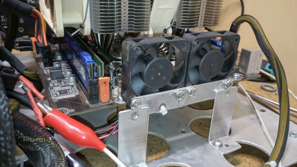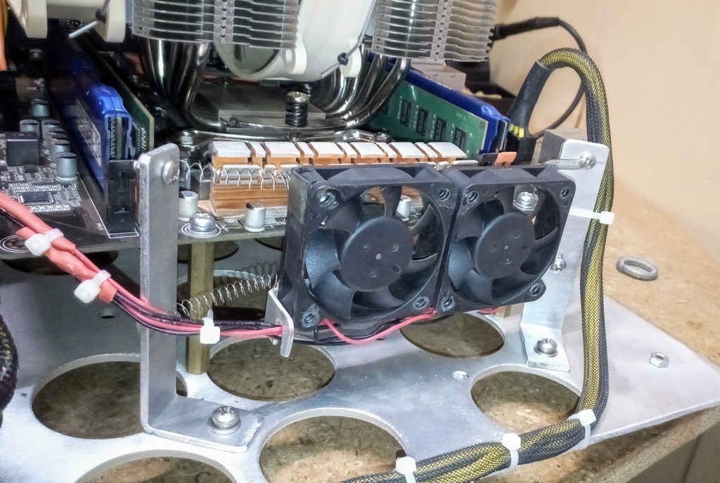 Поймал я тут резонанс. Мой старый 2667в2 ушел сынишке на замену 1280в2. Последний с его 70Вт и на брэндовой матери, конечно, никакого активного охлаждения VRM не требовал. Но 2667в2 нагревает стоковый радиатор в рендеринге до 50 даже с обдувом. Поставил пару вентиляторов. Эта пара вентиляторов уже работала на обдуве бэкплэйта видеокарты, на 7В они довольно бесшумны. Поэтому поставил без всякого демпфирования.