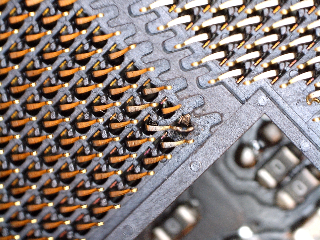 Проверил сокет, увидел странную штуку: На рисунке ниже, там где выделено зеленым нет контакта вообще, тот что выделен красным длиннее чем обычно, как будто к нему припаяли еще кусок контакта. Причем под микроскопом видно кусочек олова между соединениями.