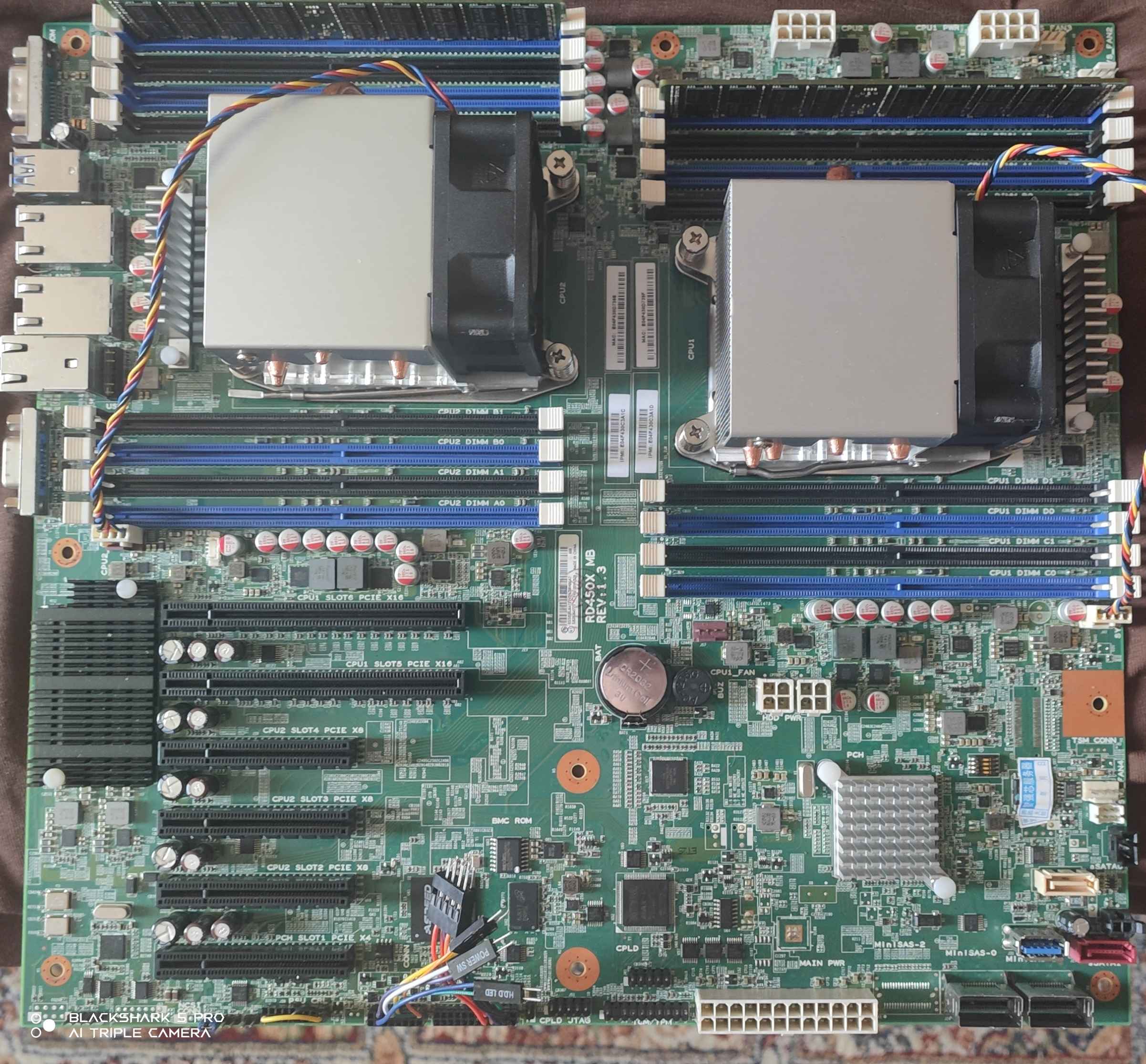 У меня при первом включении долго думала. Пару минут,может дольше. Моргала светодиодом быстрее медленнее и всё такое. После этого влкючается исправно. Первое включение было с 2я ЦПУ и по одной планке памяти на процессор. Сейчас 2 E5-2690 v4 и по 4*16Гб Hynix 2400МГц. Линки на сетевых портах поднимаются? IP адресс маршрутизатор выдаёт материнке? Если да, то можно пробовать в IPMI зайти, там хоть какойто минимум инфы можно получить.
