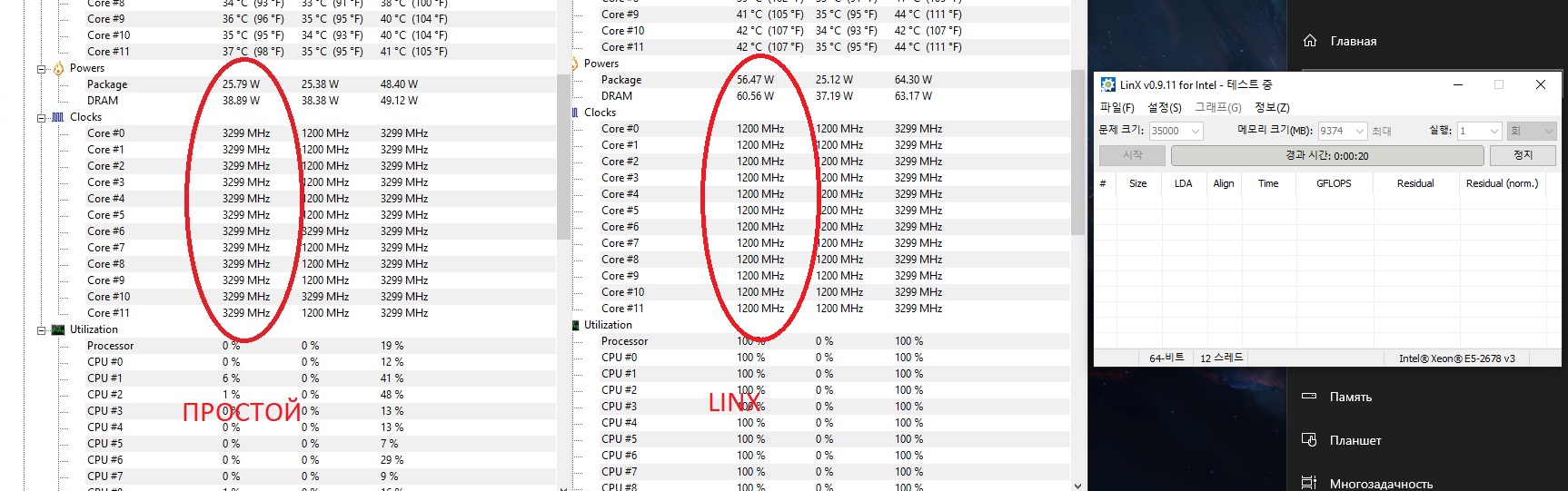 Температура процессора может отличаться в разы на разных частотах, даже без нагрузки.
