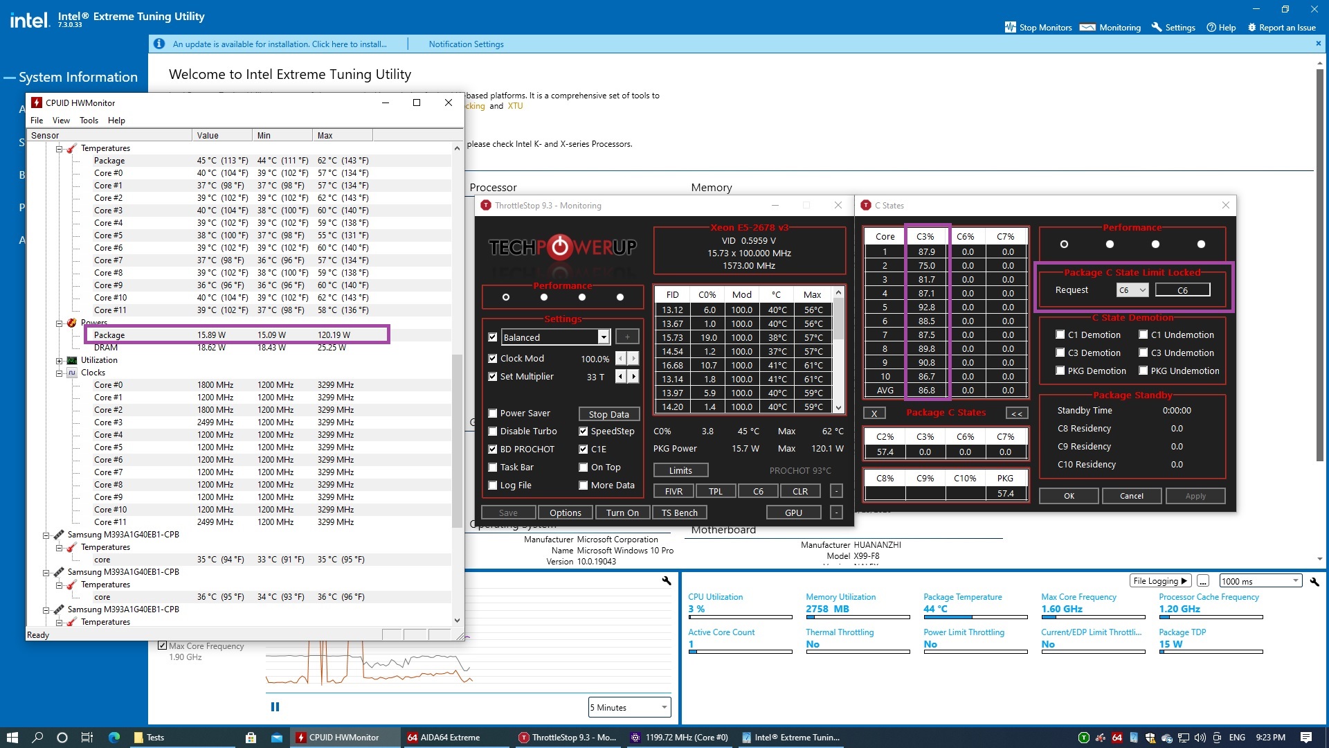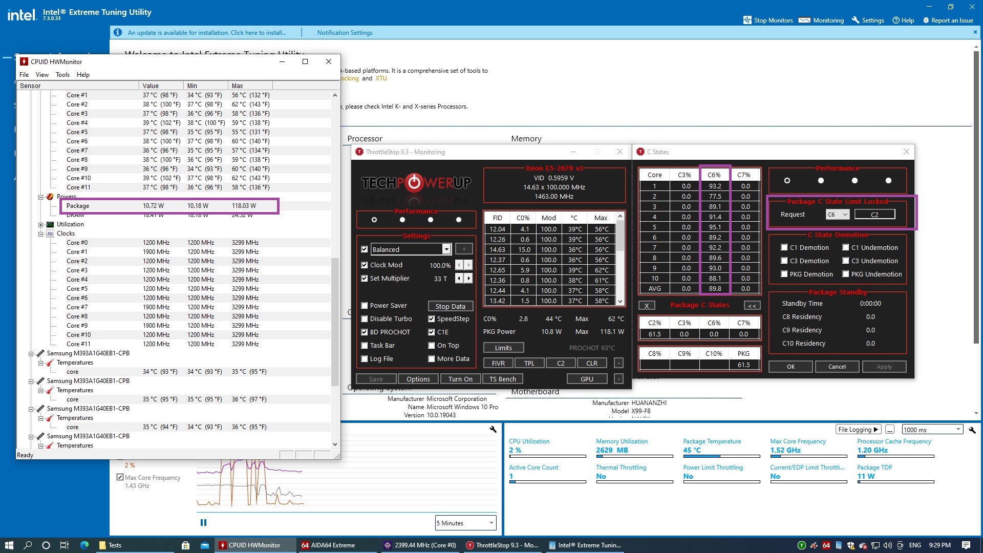 В простое с моими сеттингами потребление заметно ниже, ThrottleStop показывает проценты в колонке C6. Я понятия не имею что такое "Package C State Limit Locked". На нелоченном процессоре (1660V3) слова Locked не будет.