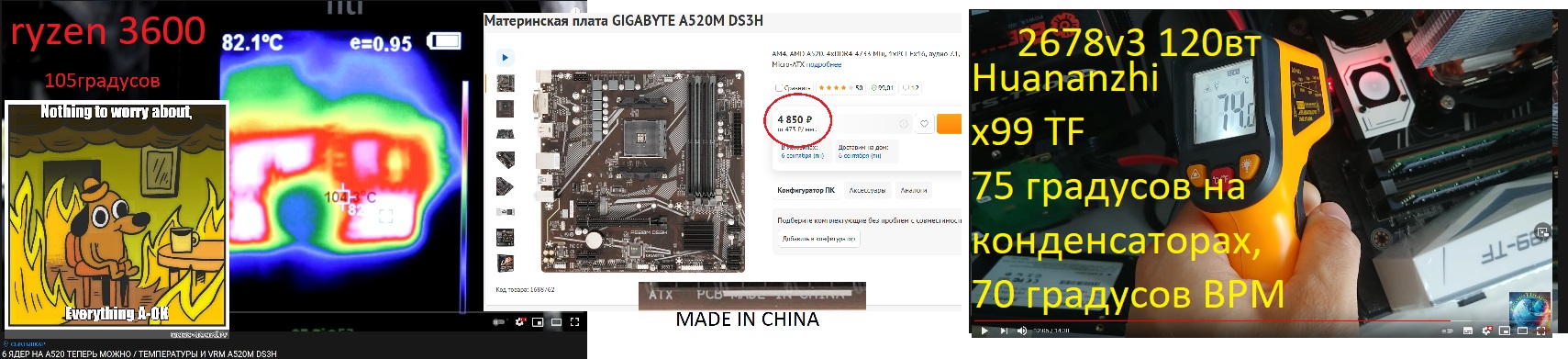 Господи как раскукарекались, одно удовольствие смотреть, как обидно стало что ТОПОВЫЙ проц стал на китаймать без танцев, разогнался ОФИЦИАЛЬНОЙ утилитой по всем пунктам без проблем, прошёл все тесты с пиком 200вт (А это уровень 5950x в разгоне! в стоке там вообще 140вт). Кококо хуанан не тащит, должен стоить 4тр. Для сравнения брендовая плата за 4850р(полюбасу лучше ТФ ) с райзен 5 3600 - 105 Градусов на ВРМ. Хуанан 75 градусов на кондерах, на радиаторе ВРМ ещё ниже, около 70 градусов.