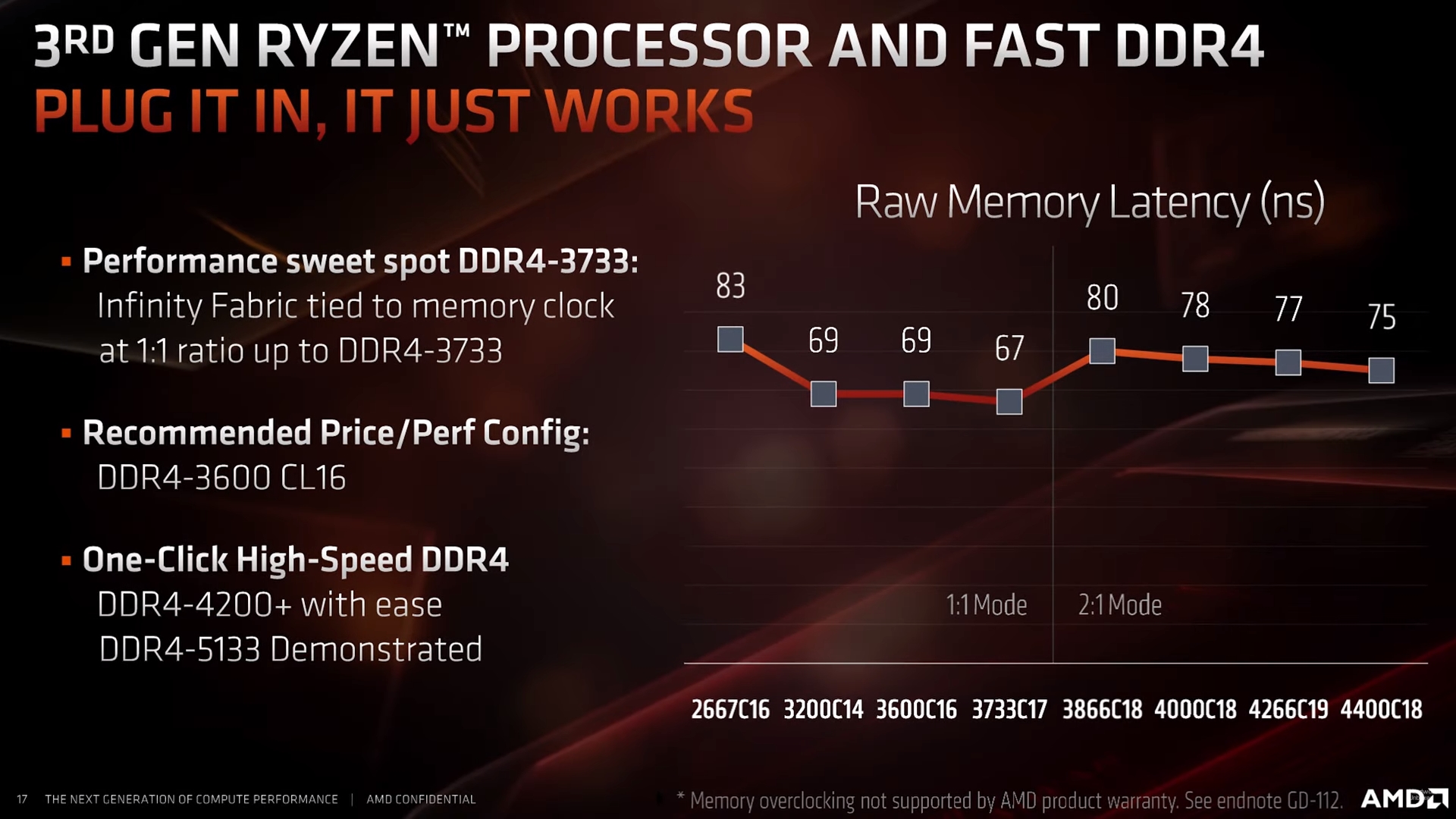 Performance sweet spot DDR4-3733 (infinity fabric tied to memory clock 1:1) Recommended Price/Perf: DDR4-3600 CL16 One Click High speed DDR4: DDR4-4200+ with ease, DDR4-5133 demonstrated