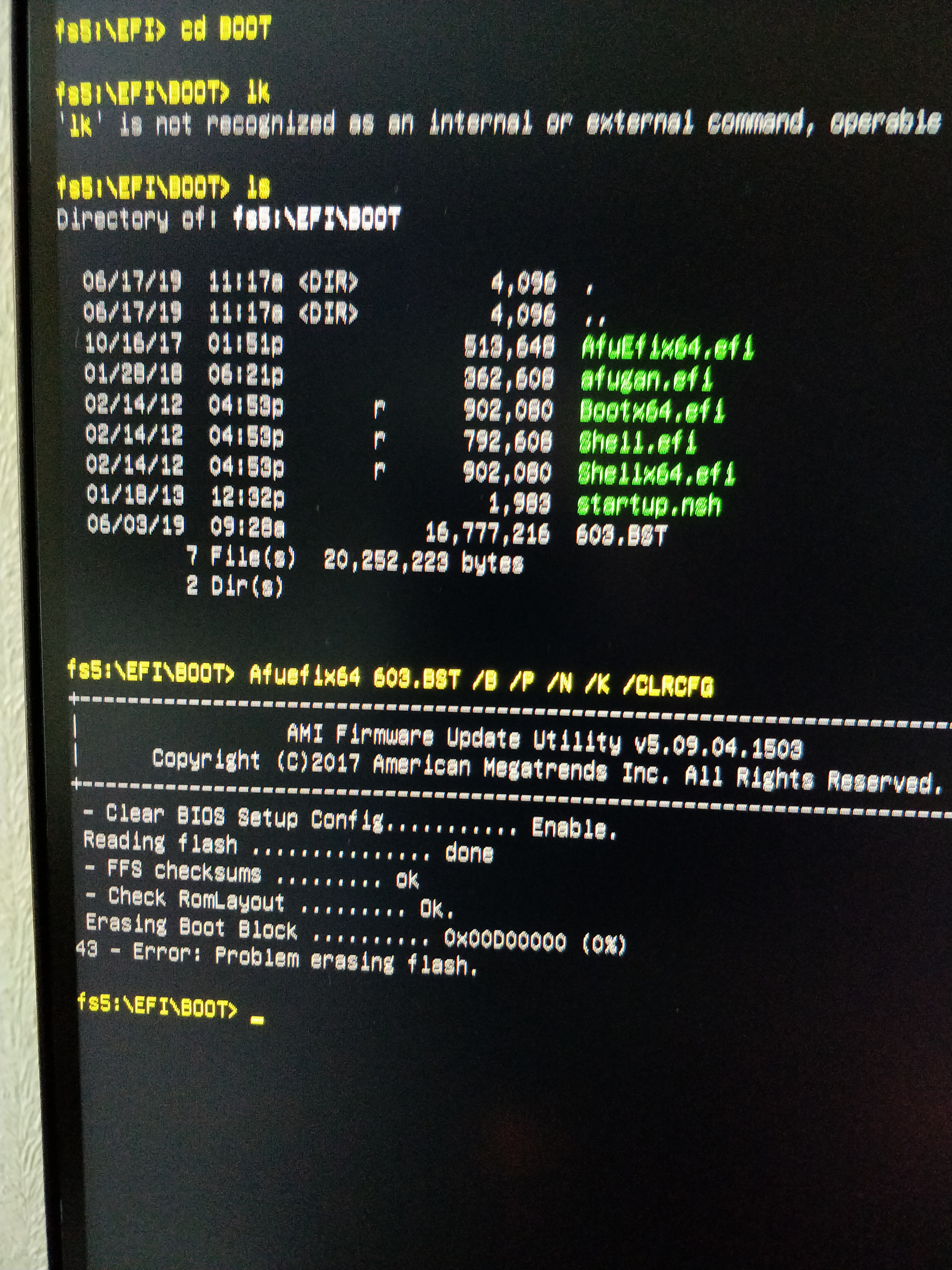 Подскажите, пытаюсь перепрошить биос как написано тут: Процессоры AMD Ryzen 1000-й серии (Summit Ridge\Zen\14nm\AM4) #15345464 Биос от разработчика. На этапе ввода команды cd BOOT ничего не происходит. Такое ощущение что команда ввелась, но результат вышел за края экрана. Пробовал стрелками двигать вниз, но ничего не происходит. На сочетание клавиш Alt Ctrl Delete комп реагирует, происходит перезагрузка. В чём может быть проблема?